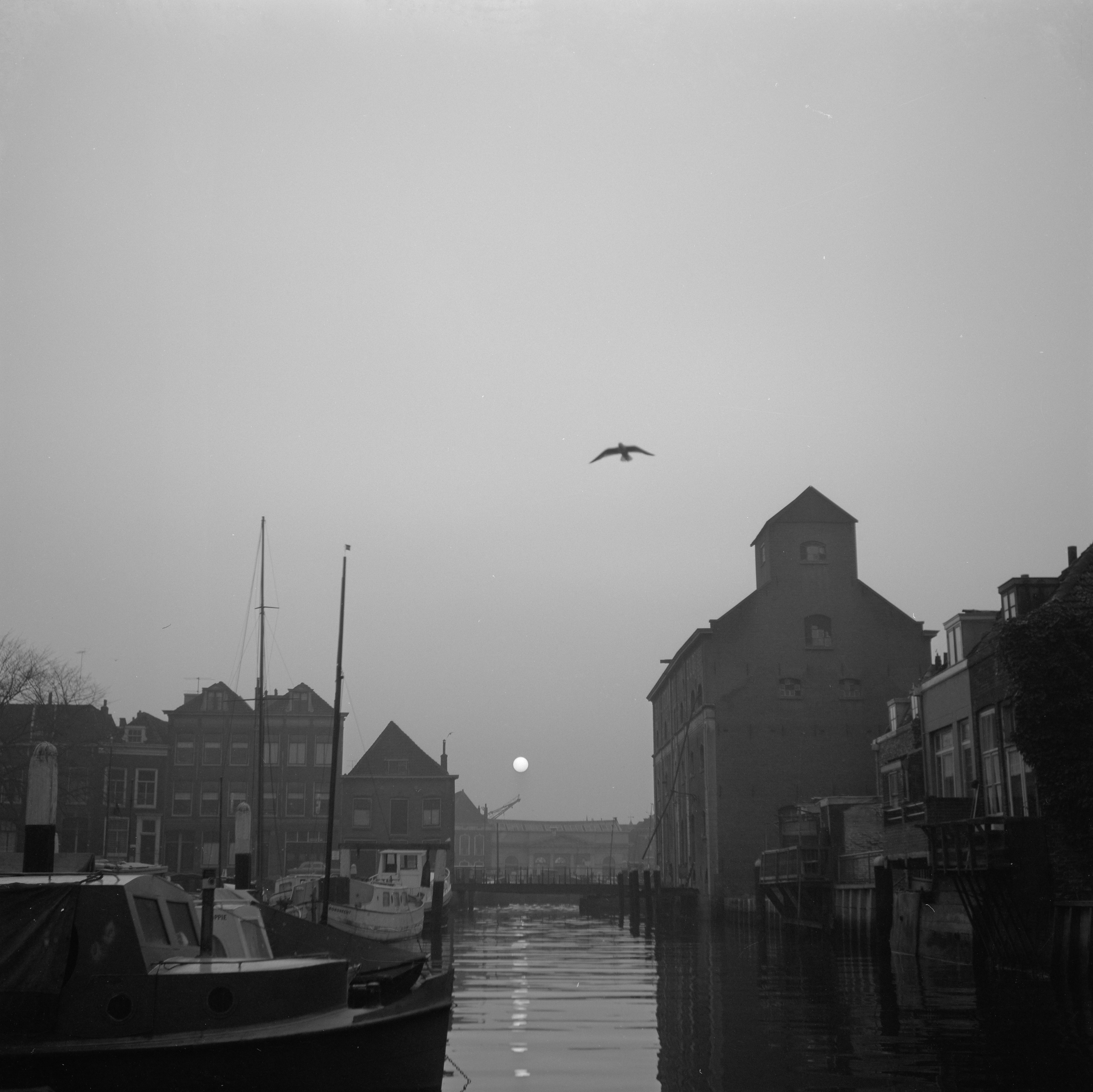 Het Maartensgat vanaf Korte Engelenburgerkade richting Korte Geldersekade (links) en Zakkendragersbrug. Rechts het graanpakhuis van Kluizenaar en In 't Veld.