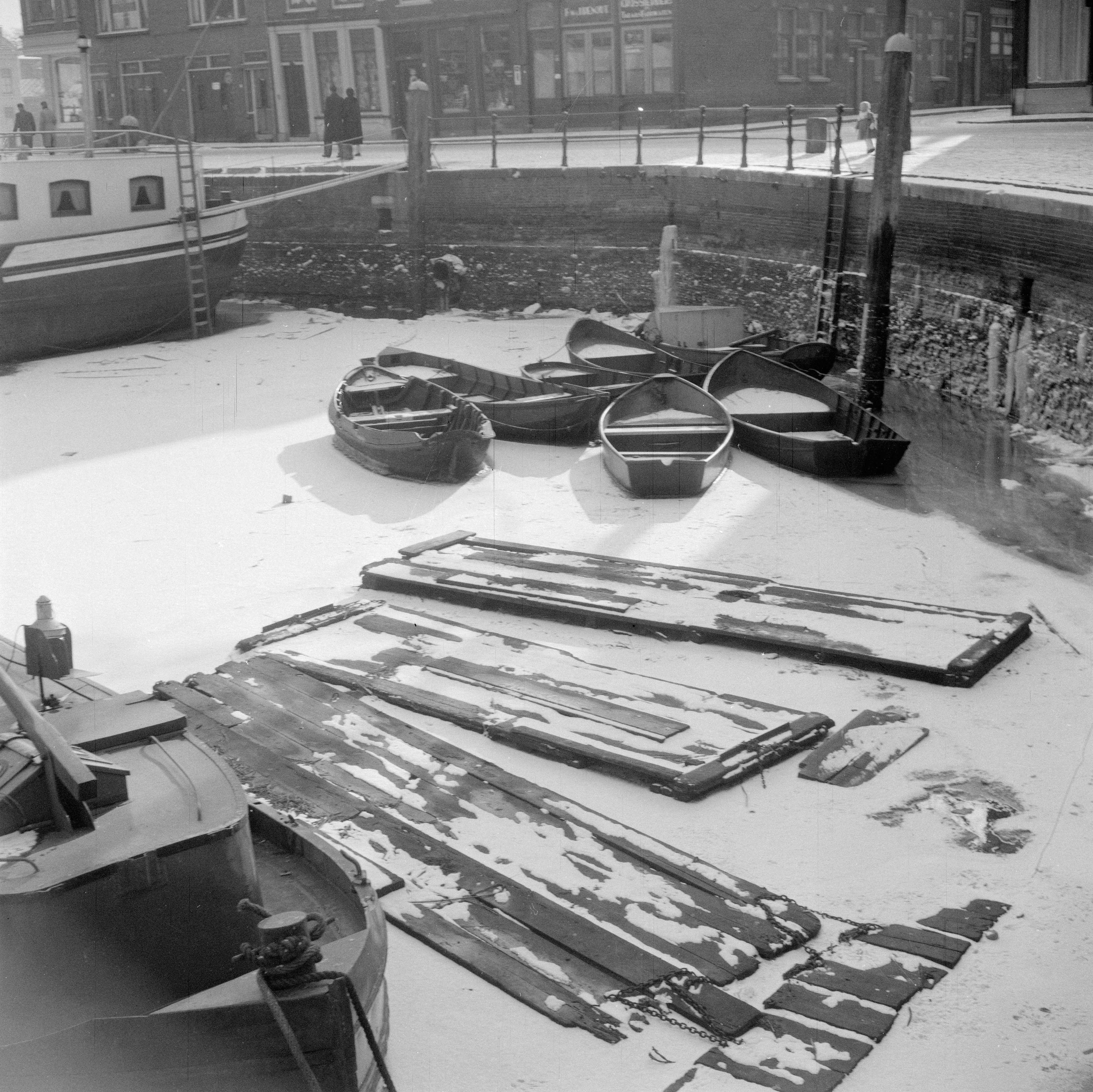 - Bevroren en besneeuwde Wolwevershaven. Op de achtergrond het Vlak en meer naar rechts de Hoge Nieuwstraat.