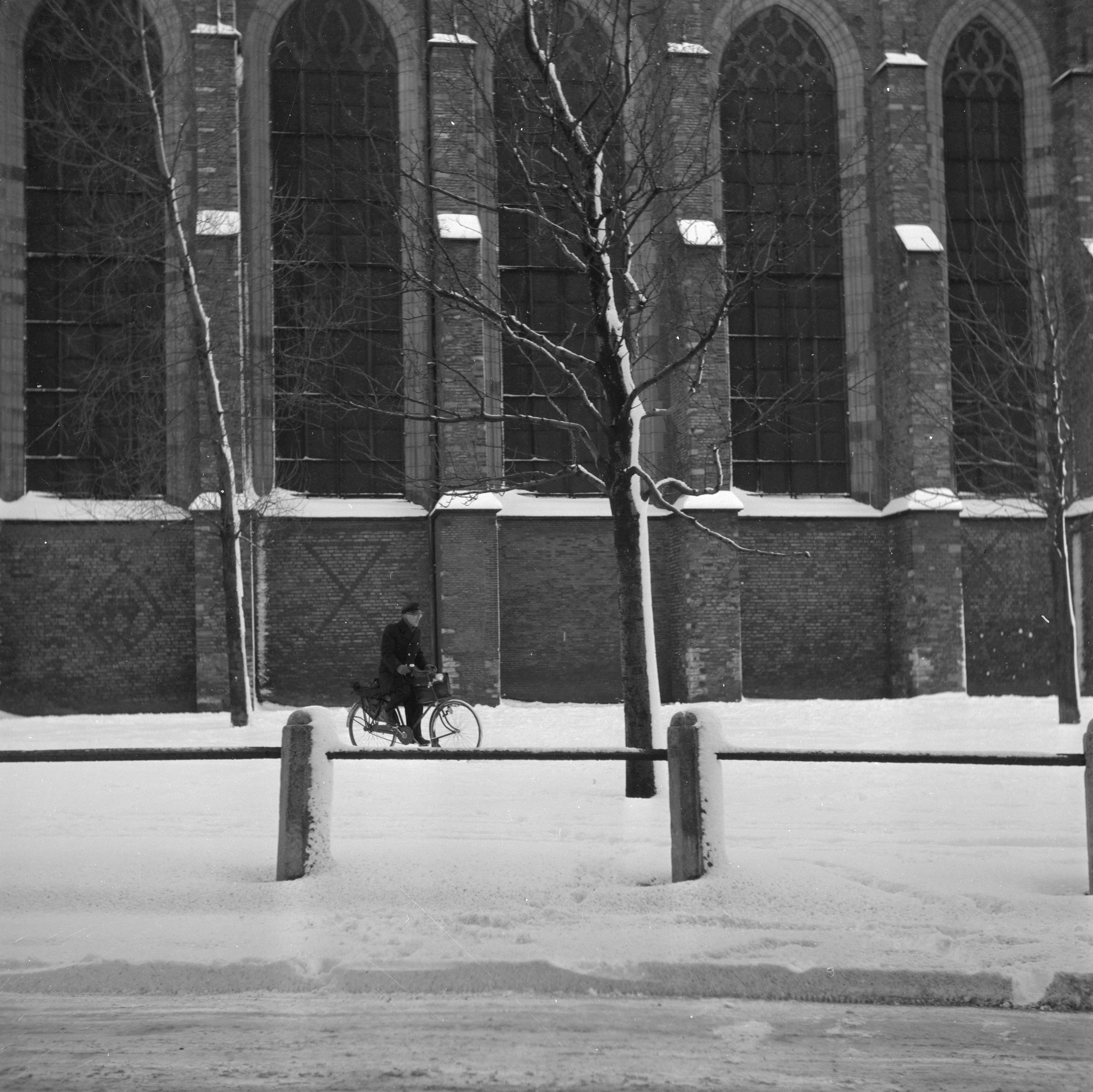 - Fietser op het Grotekerksplein voor de Grote Kerk.