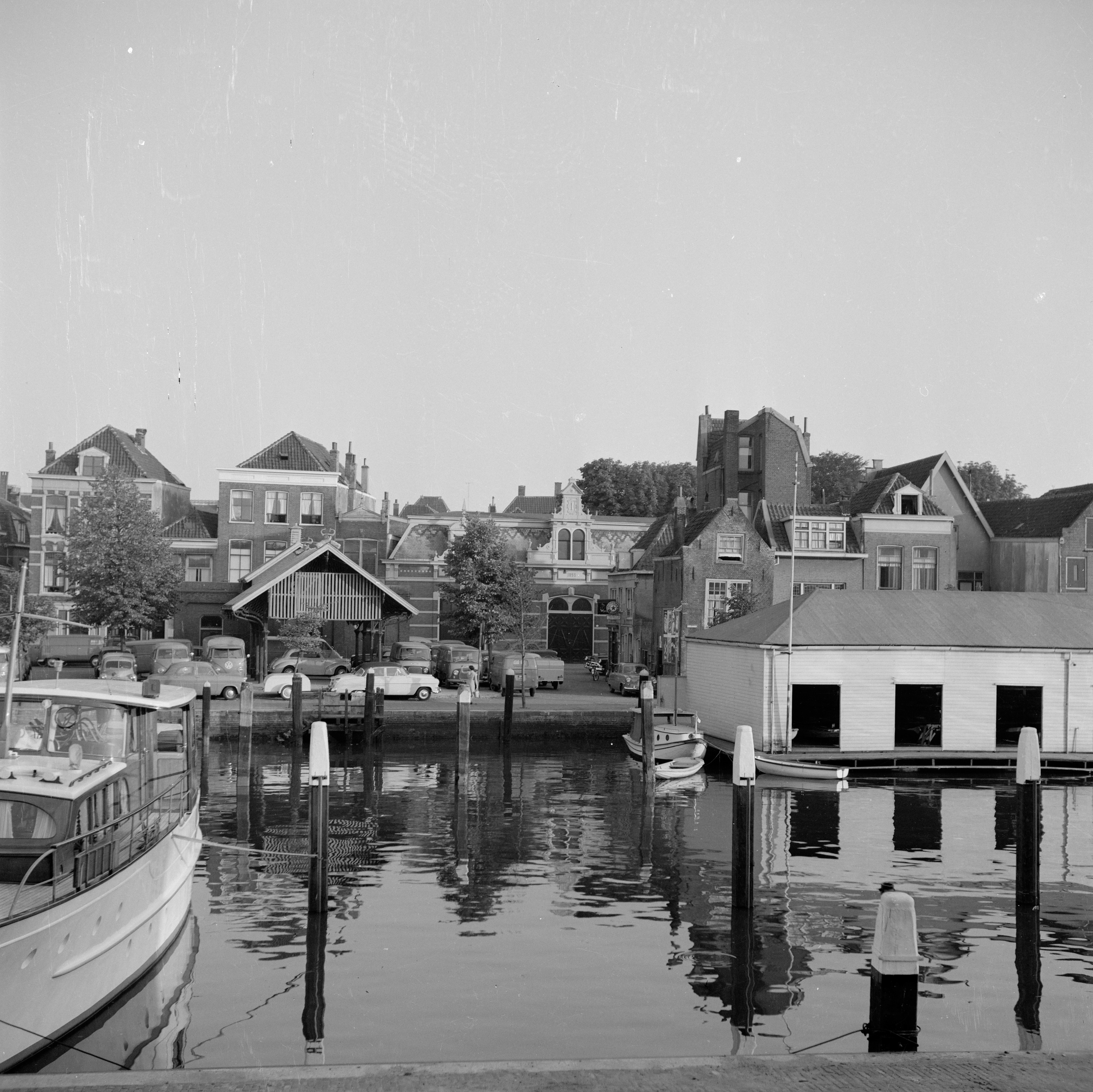 De Nieuwe Haven met het botenhuis van de roei- en zeilvereniging. Links ervan is de Vismarkt met een doorkijk naar de Varkenmarkt. Langs het water aan de overkant is de Knolhaven.