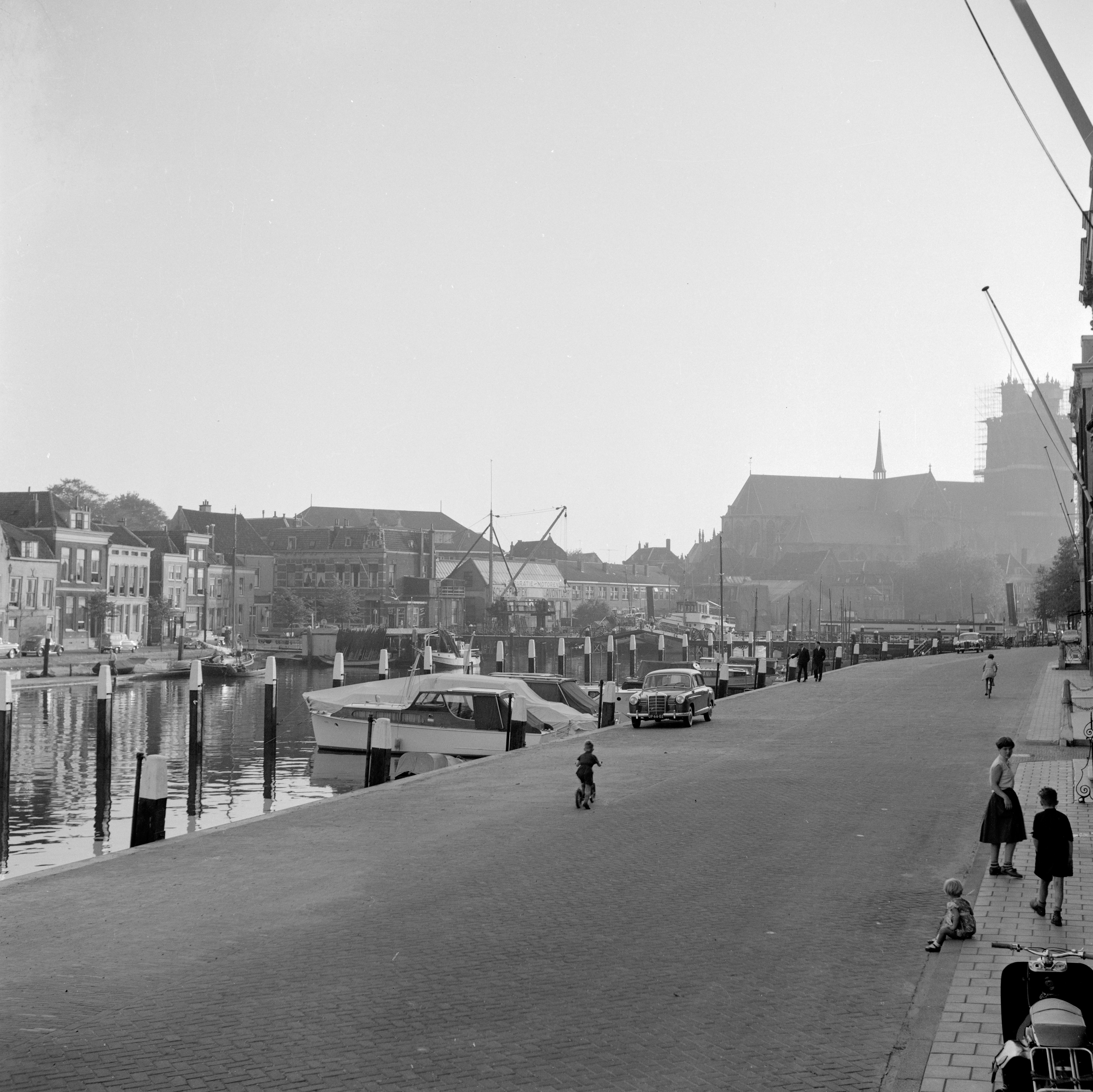 De Nieuwe Haven in de richting van de Lange IJzerenbrug en de Grote Kerk. Links voor de …