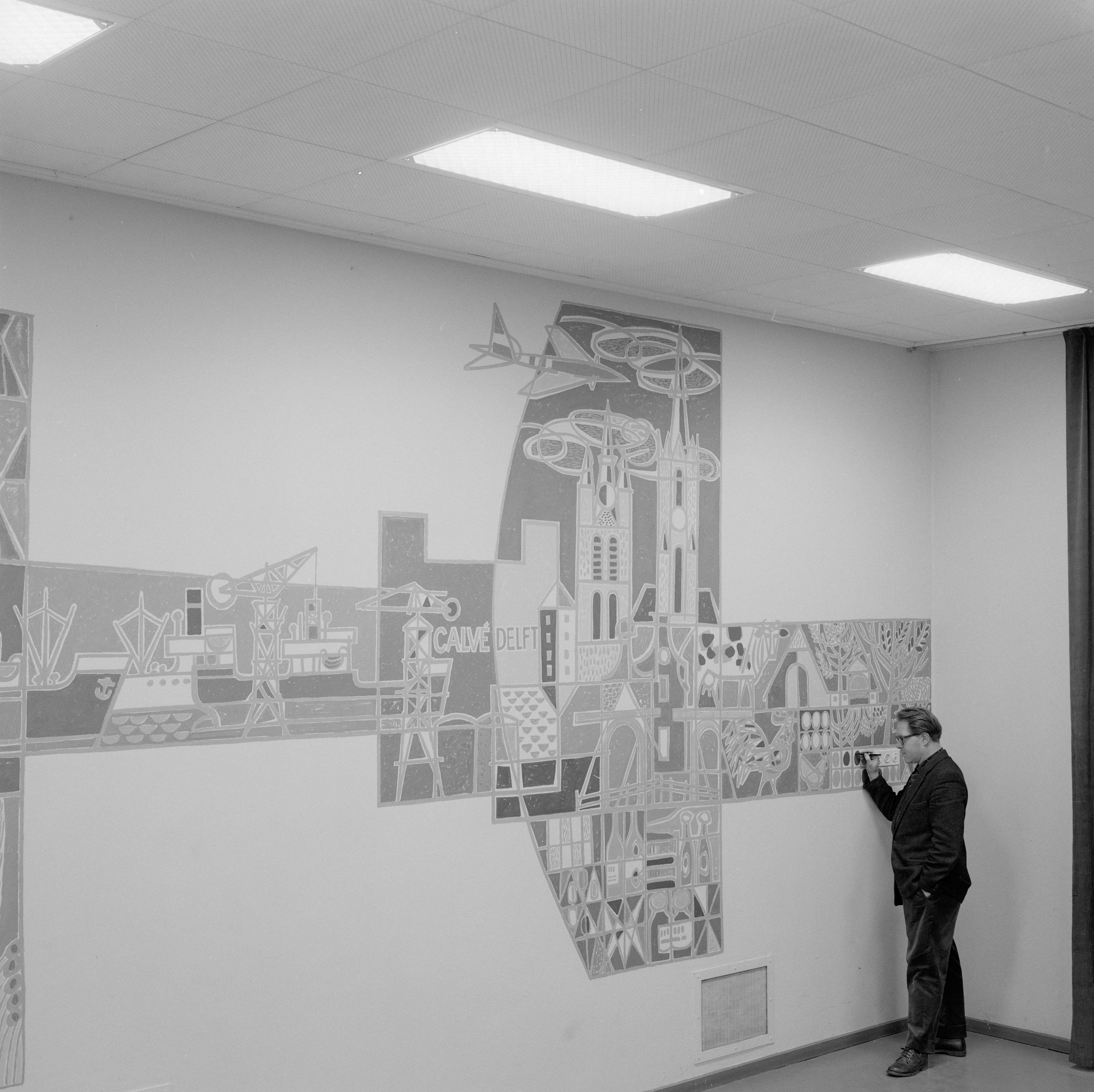 Otto Dicke bij zijn kunstwerk voor Calvé Delft.