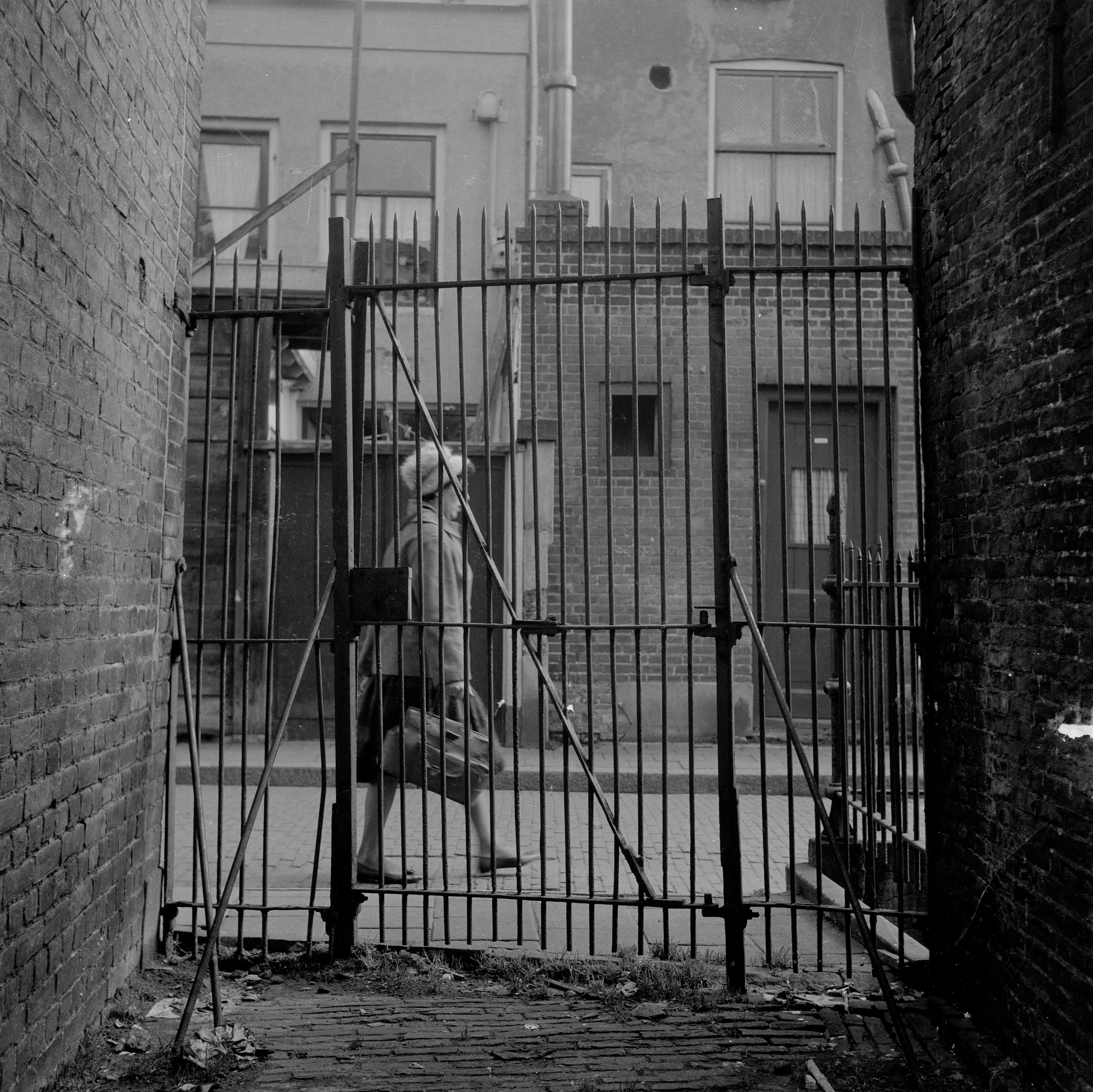 De Lindenstraat gezien vanuit de naamloze gang tussen de Kromme Elleboog en de Kolfstraat, in de volksmond de Kromme Jen.