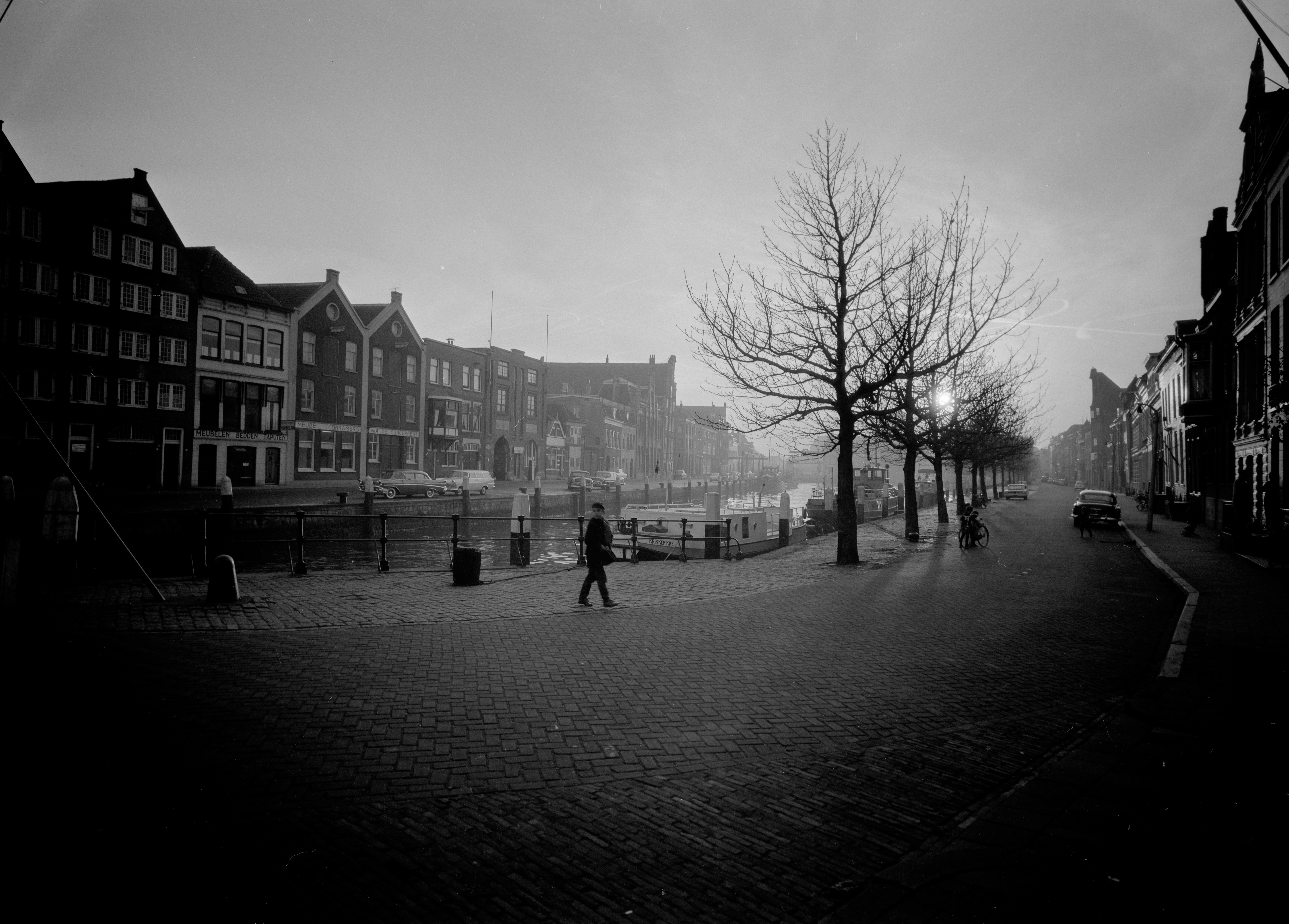 De Kuipershaven (links) en de Wolwevershaven met het hoge puntdak van pakhuis Stokholm, vanaf de Damiatebrug richting Vlak.