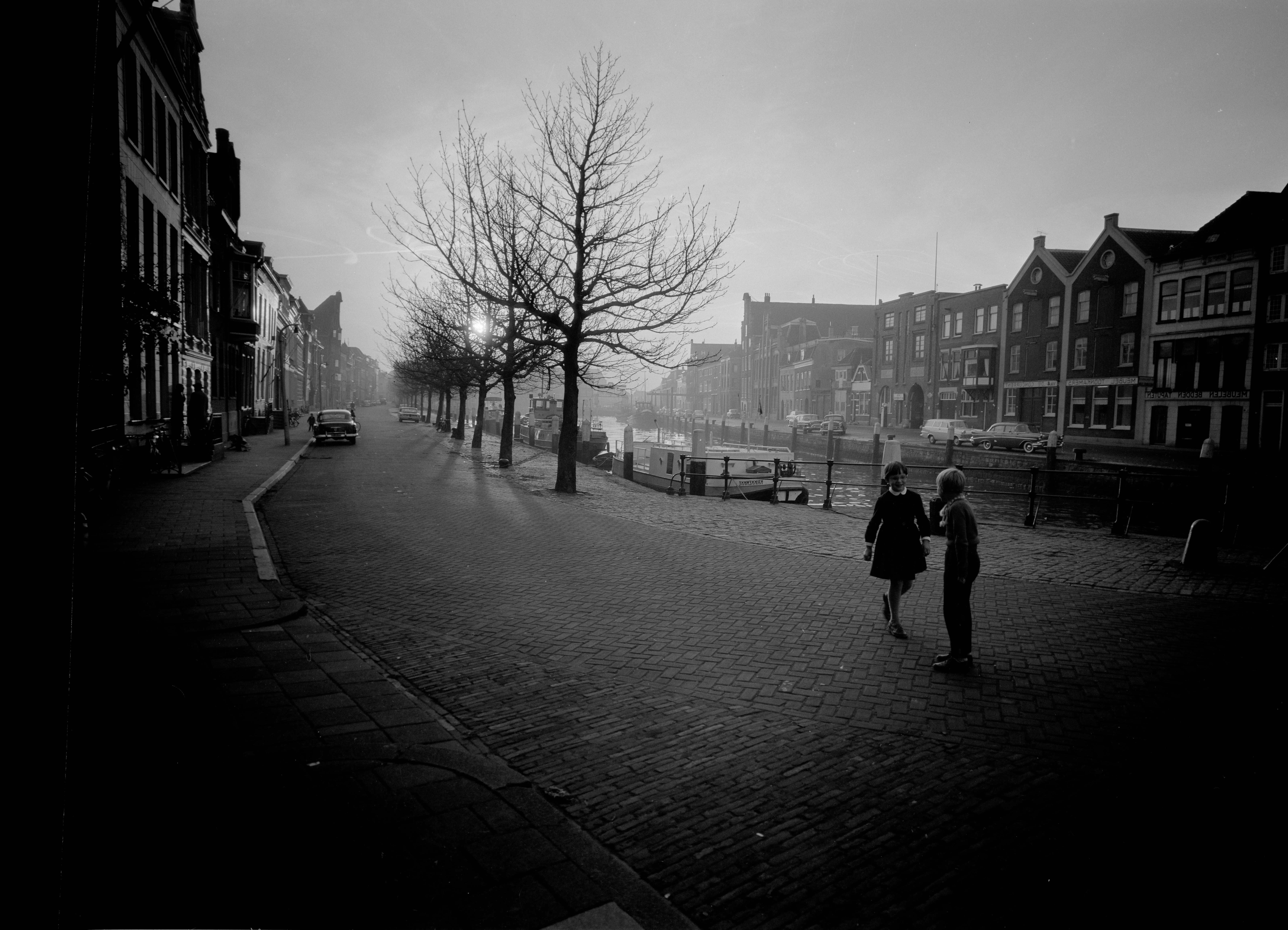 De Wolwevershaven vanaf het Vlak richting Damiatebrug. Het hoge dak is van pakhuis Stokholm, Rechts de Kuipershaven.