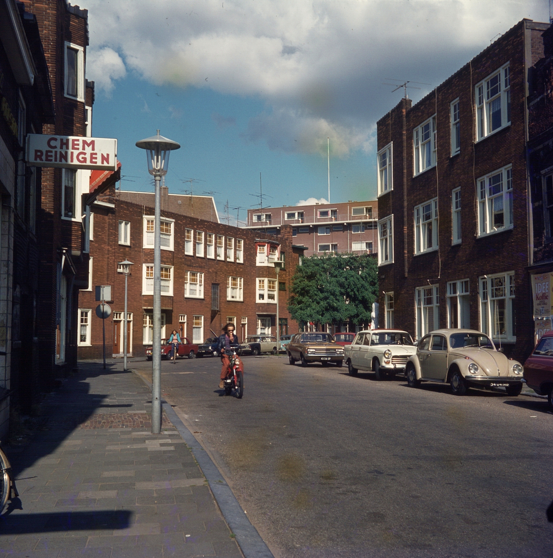 auto's bromfietsen / brommers fietsers lantaarns / straatverlichting televisieantennes