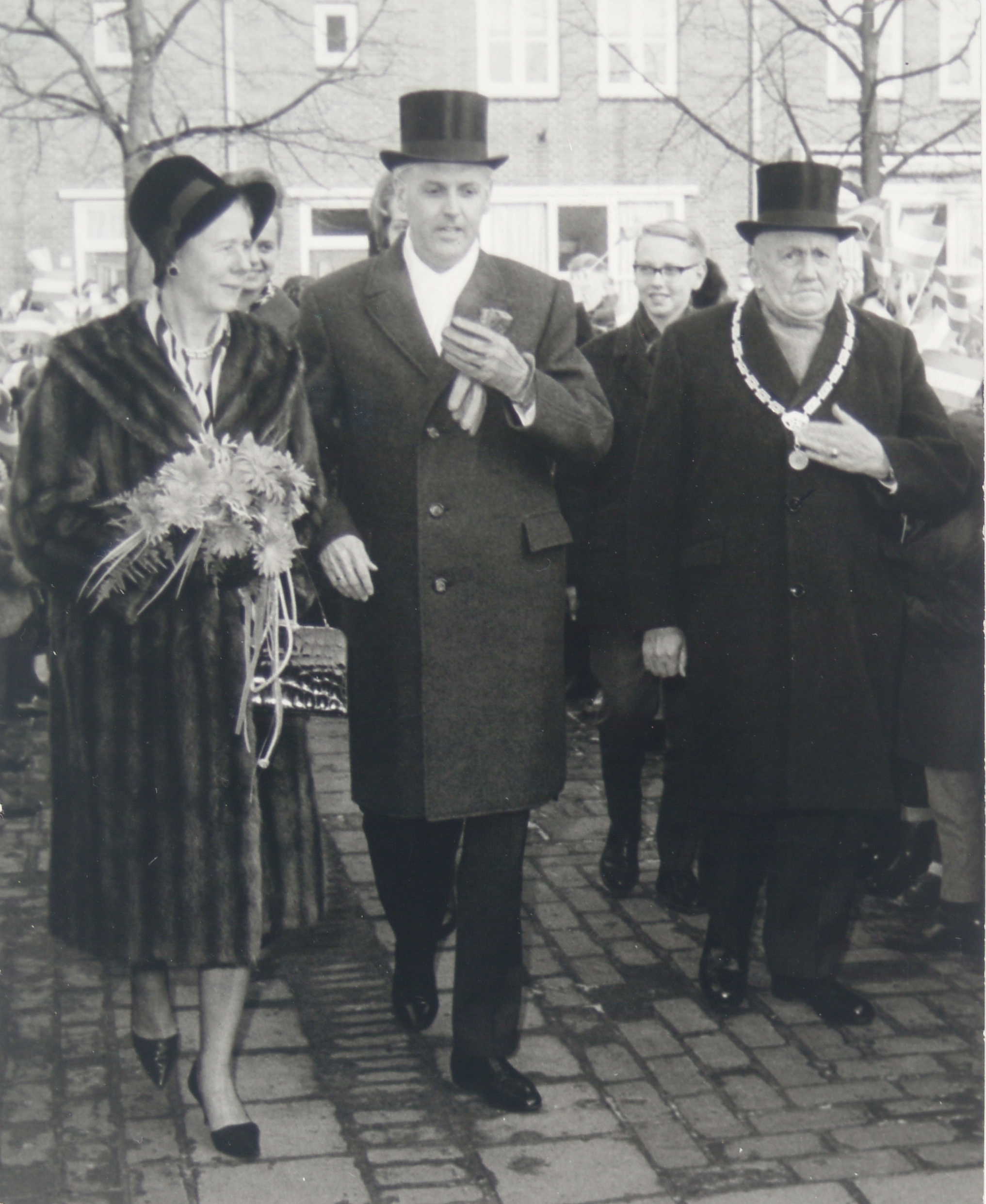 - Aankomst burgemeester J.C. de Ridder van Hendrik-Ido-Ambacht bij het gemeentehuis aan het Oude Raadhuisplein.
