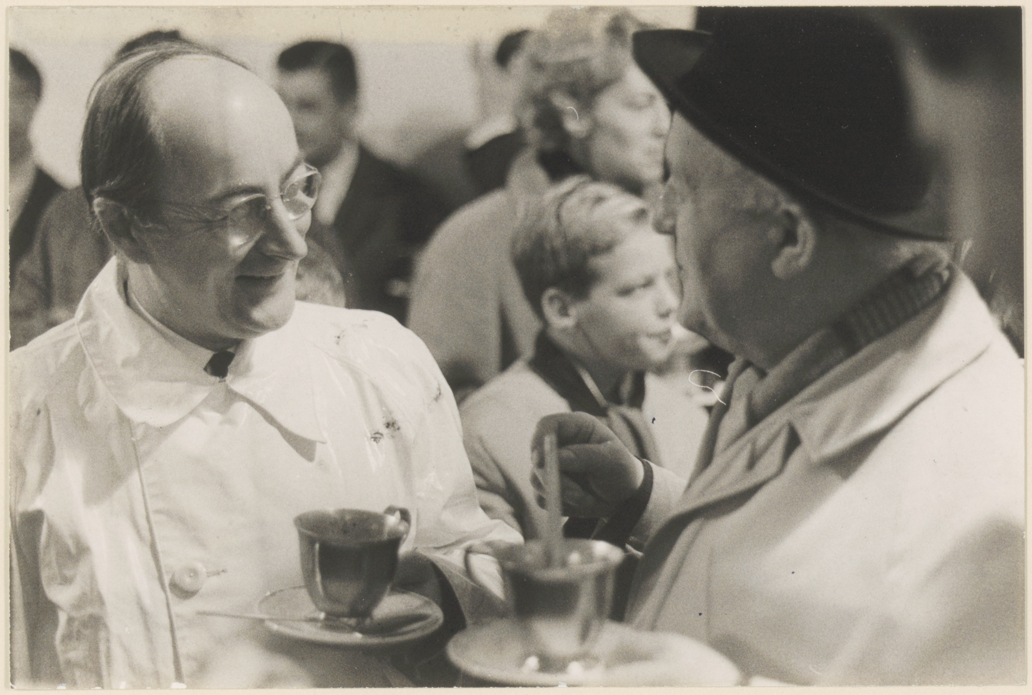 - Burgemeester mr. J.J. v.d. Lee in witte jas, die zojuist de eerste paal voor de nieuwe scheepswerf van Hoebee aan de Eerste Merwedehaven heeft geslagen, converseert met de eveneens erwtensoep etende G.P. de Ruiter, oud-directeur van de ABN.