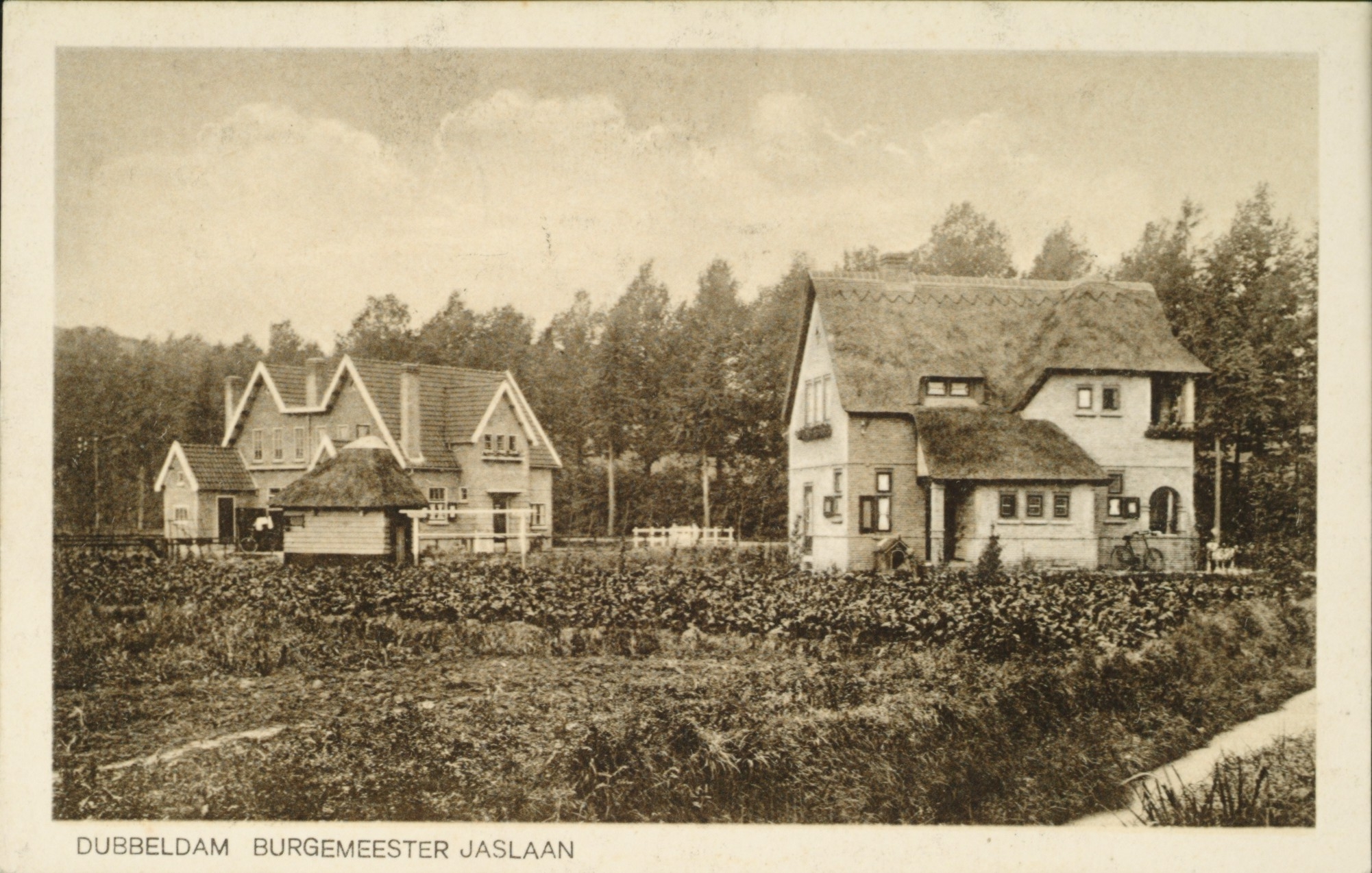 Achterzijde van huizen aan Burgemeester Jaslaan, landgoed Dordwijk op de achtergrond.