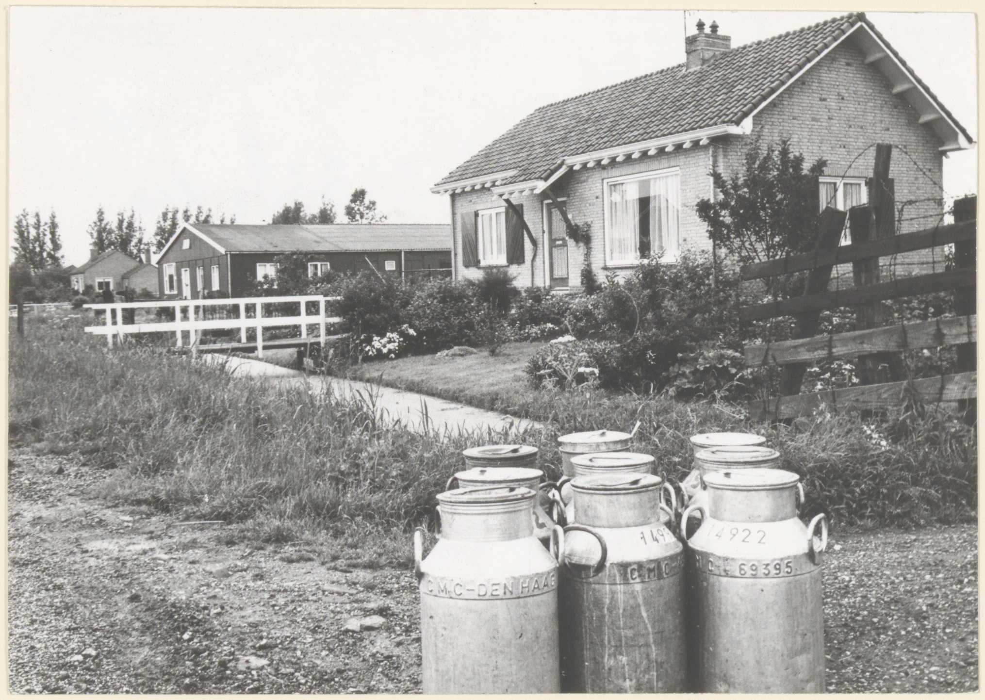 - Een naoorlogs huis, vrijstaand, met erachter een loods aan een sloot met bruggetje, misschien bij de Provinciale Weg of de Zuidendijk; op de voorgrond 9 melkbussen van C.M.C. Den Haag.