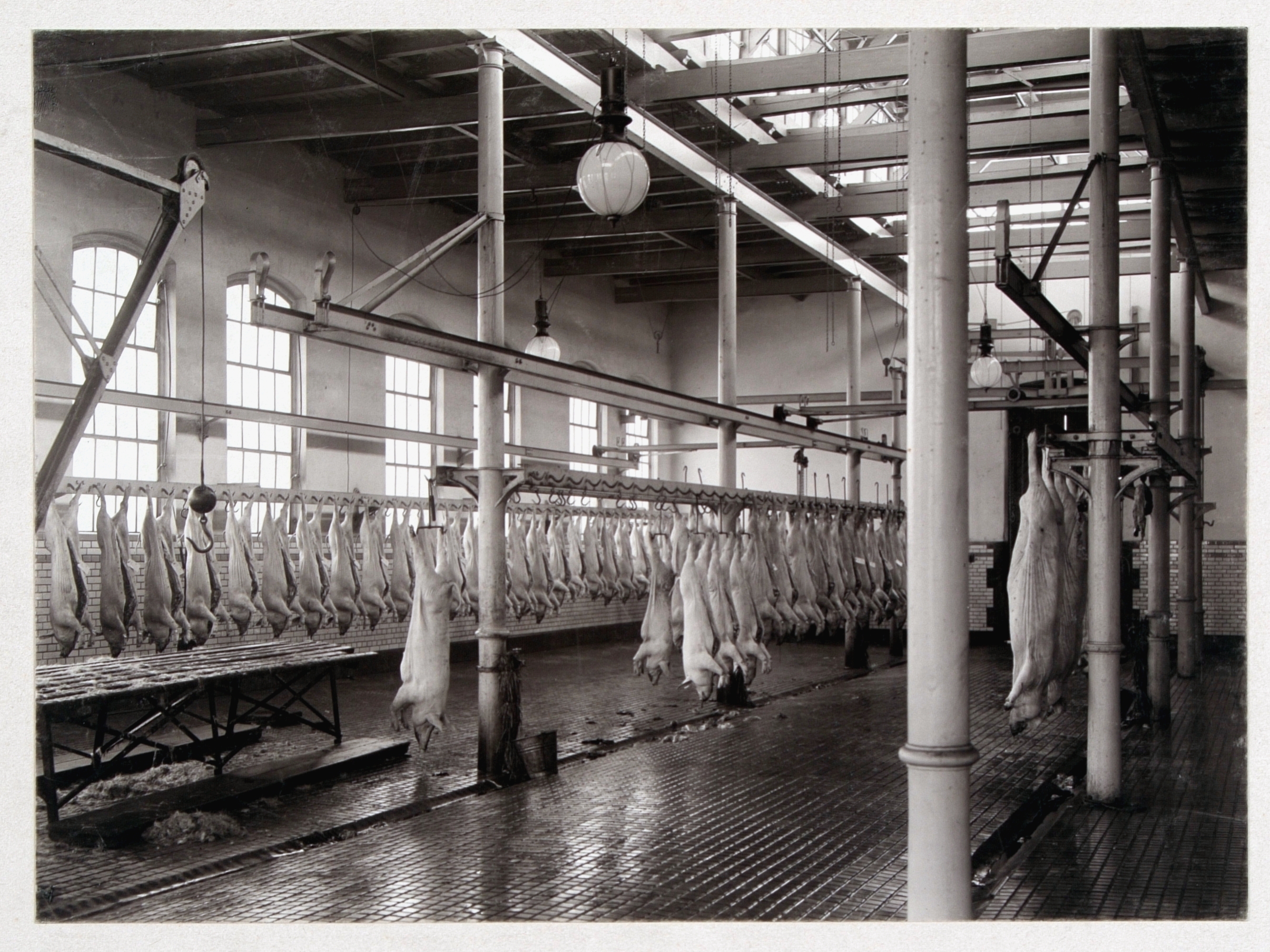 - Hal met varkens in het slachthuis aan de Markettenweg.