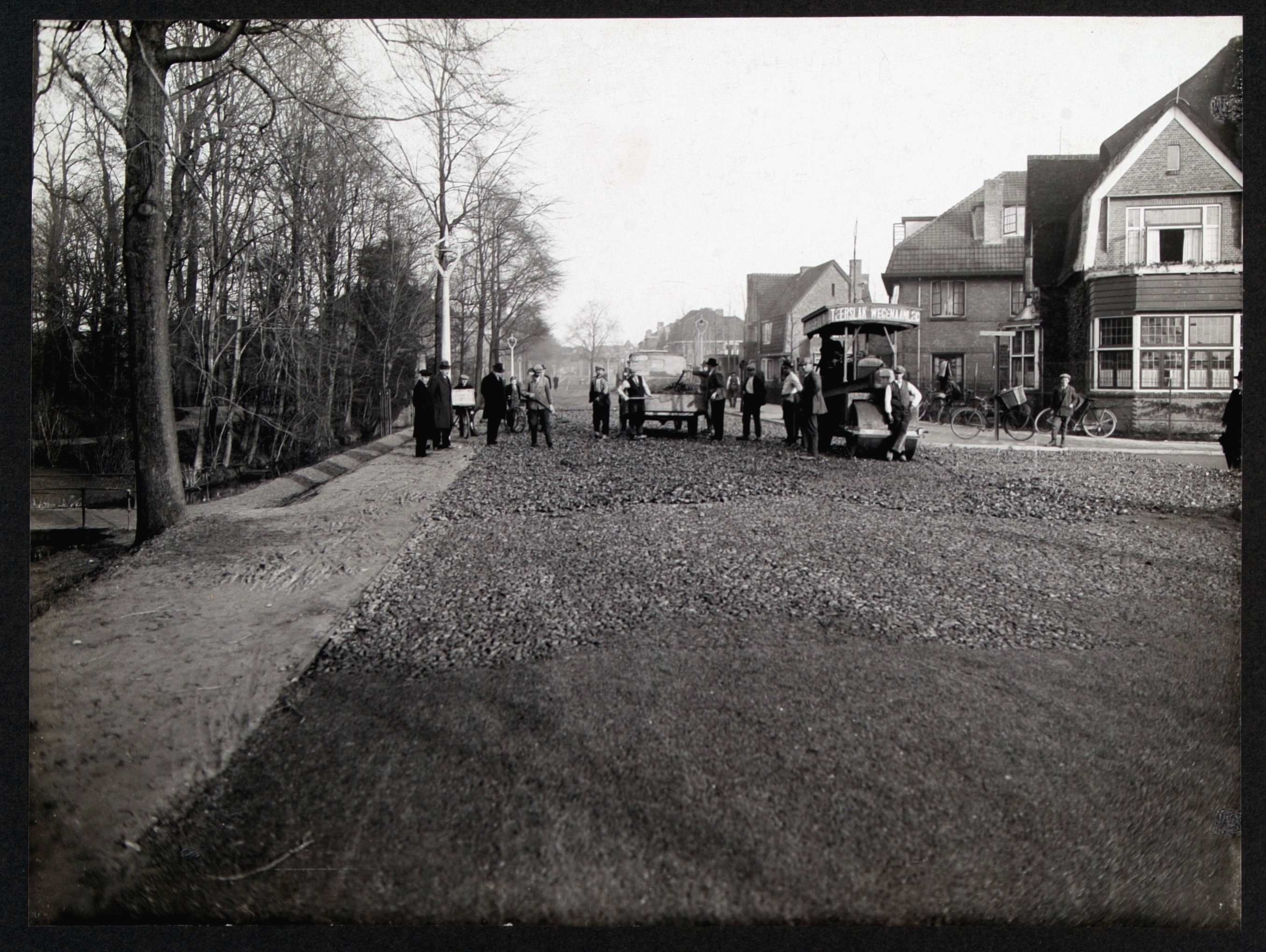 arbeiders / werklieden parken stoomwalsen wegenonderhoud