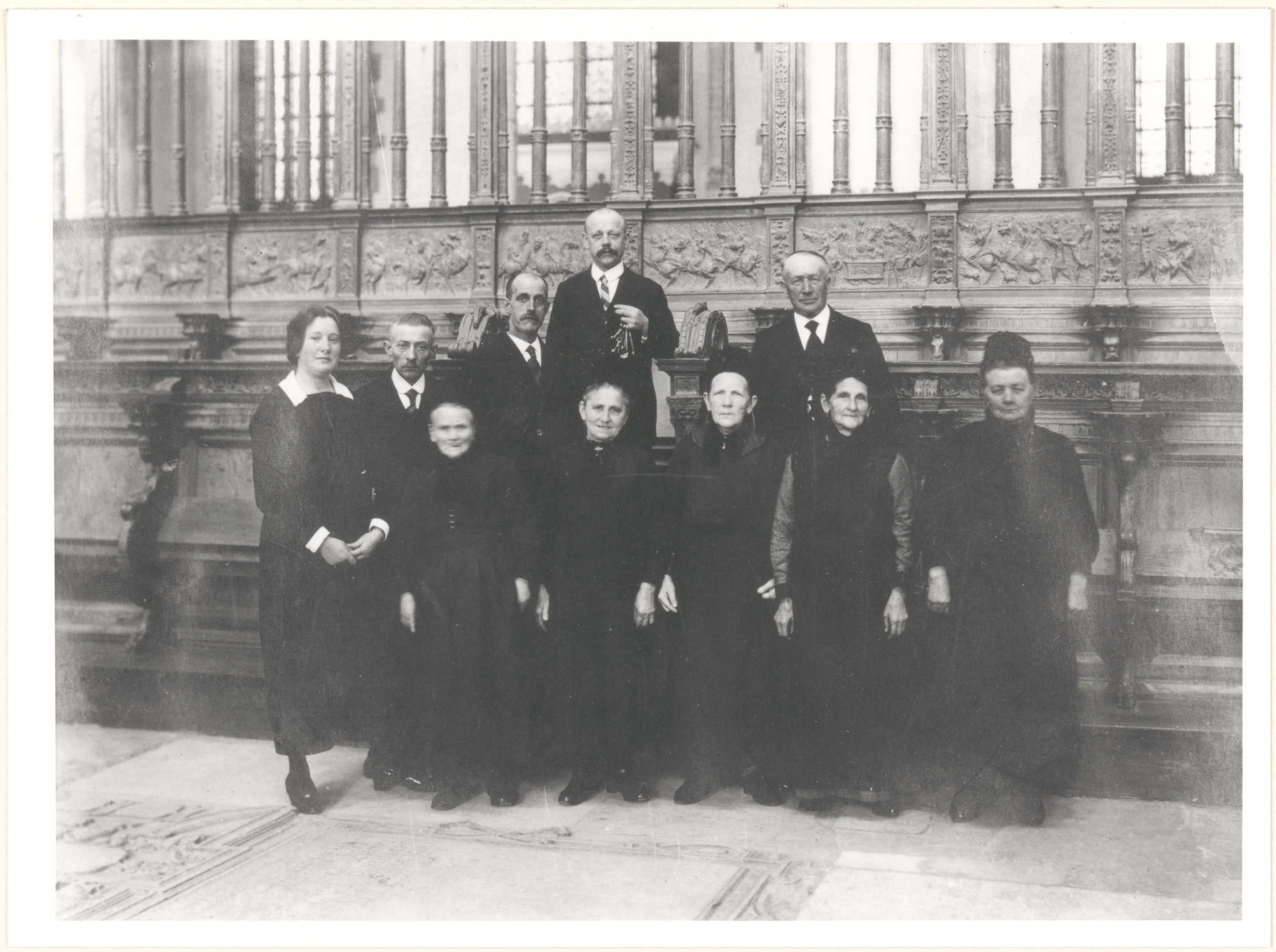 - Groepsportret van een vijftal stovenzetsters vergezeld van een wat jongere vrouw (een kosteres?) en een viertal heren, waarvan er één een bos sleutels vasthoudt (kosters, kerkvoogden?), staande voor de koorbanken in de Grote Kerk.