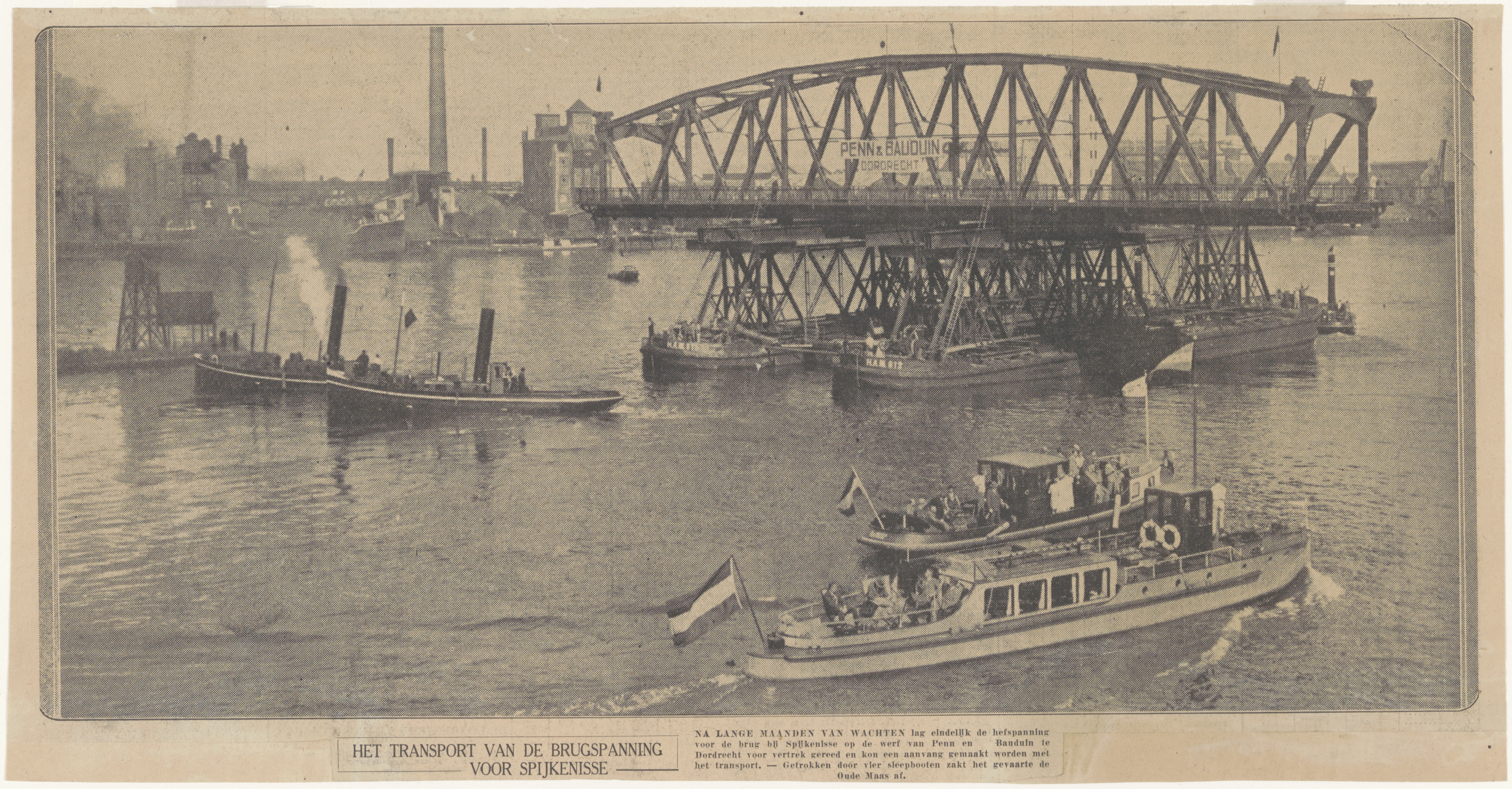 Transport van de brugspanning voor de brug over de Oude Maas bij Spijkenisse. Het transport passeert de industrieterreinen ten zuiden van de spoorwegbrug te Zwijndrecht.