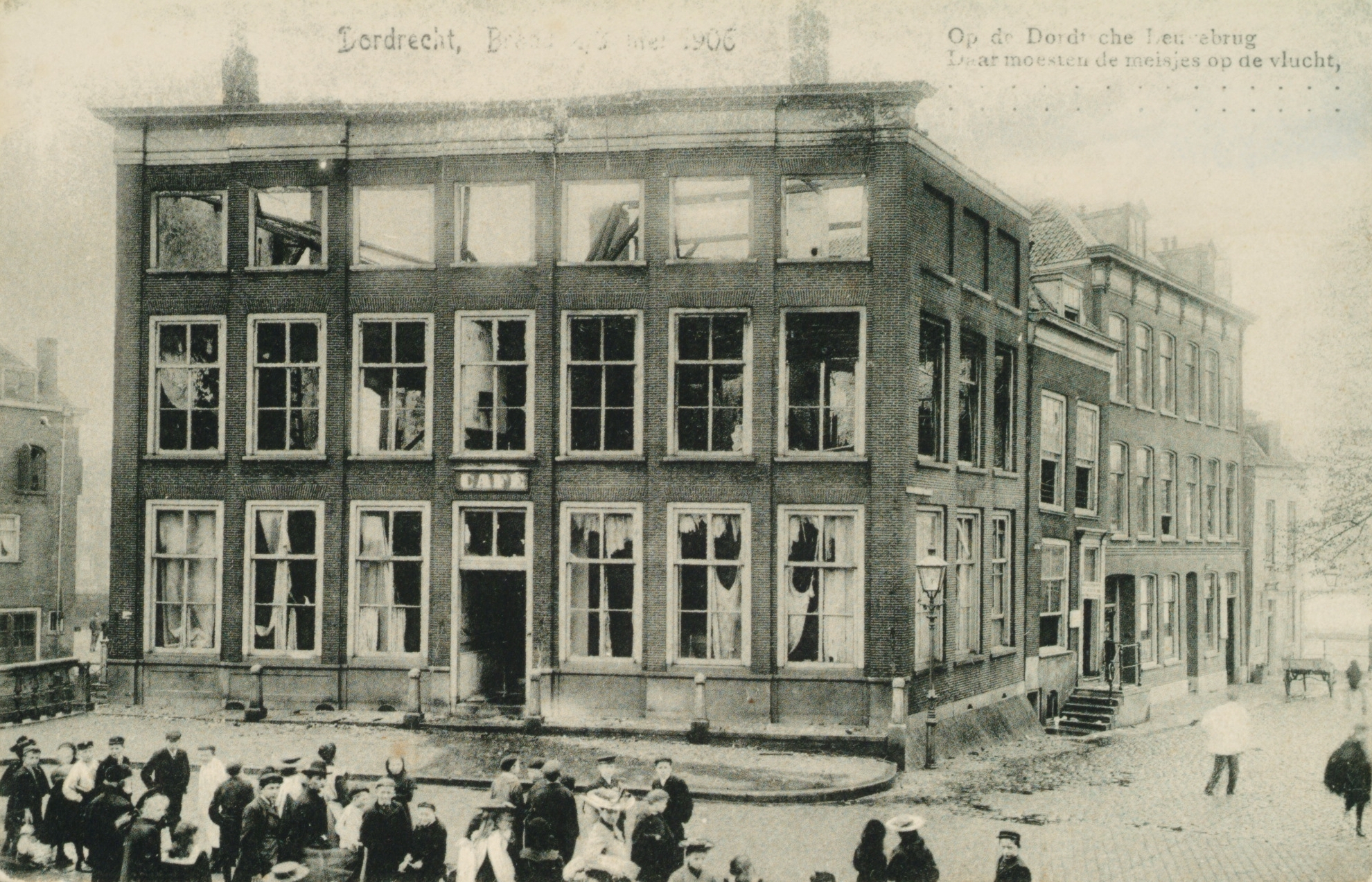 Woensdag 2 Mei 's avonds te pl.m. 11 uur ontstond er een hevige uitslaande brand in het groote hotel-cafe, gelegen aan de 'Leuvebrug' (einde Voorstraat) te Dordrecht. In een oogwenk stond het gehele gebouw in lichtelaaie, zoodat de stoomspuiten, 1 rijdende en 2 drijvende, moesten aanrukken. De enorme massa water, welke deze in de vlammen wierpen, hielden uitbreiding tegen, zoodat de brand tot het hotel beperkt bleef, alhoewel de belende gebouwen door den hevigen wind veel gevaar liepen. Te half 1 ongeveer was de brand gebluscht en konden de stoomspuiten inrukken. Natuurlijk was er een massa volk op de been, daar de hoog oplaaiende vlammen, zich afspiegelend in het water, een tooverachtigen aanblik opleverden. Naar we vernemen dekt assurantie de schade. Oorzaak van den brand onbekend. [Nieuwe Gorinchemsche Courant 6-5-1906; http://gorinchem.courant.nu] - Leuvebrug 1. W. Struif, hotelhouder + N. Cnosses [Dordrecht, adresboek 1906]