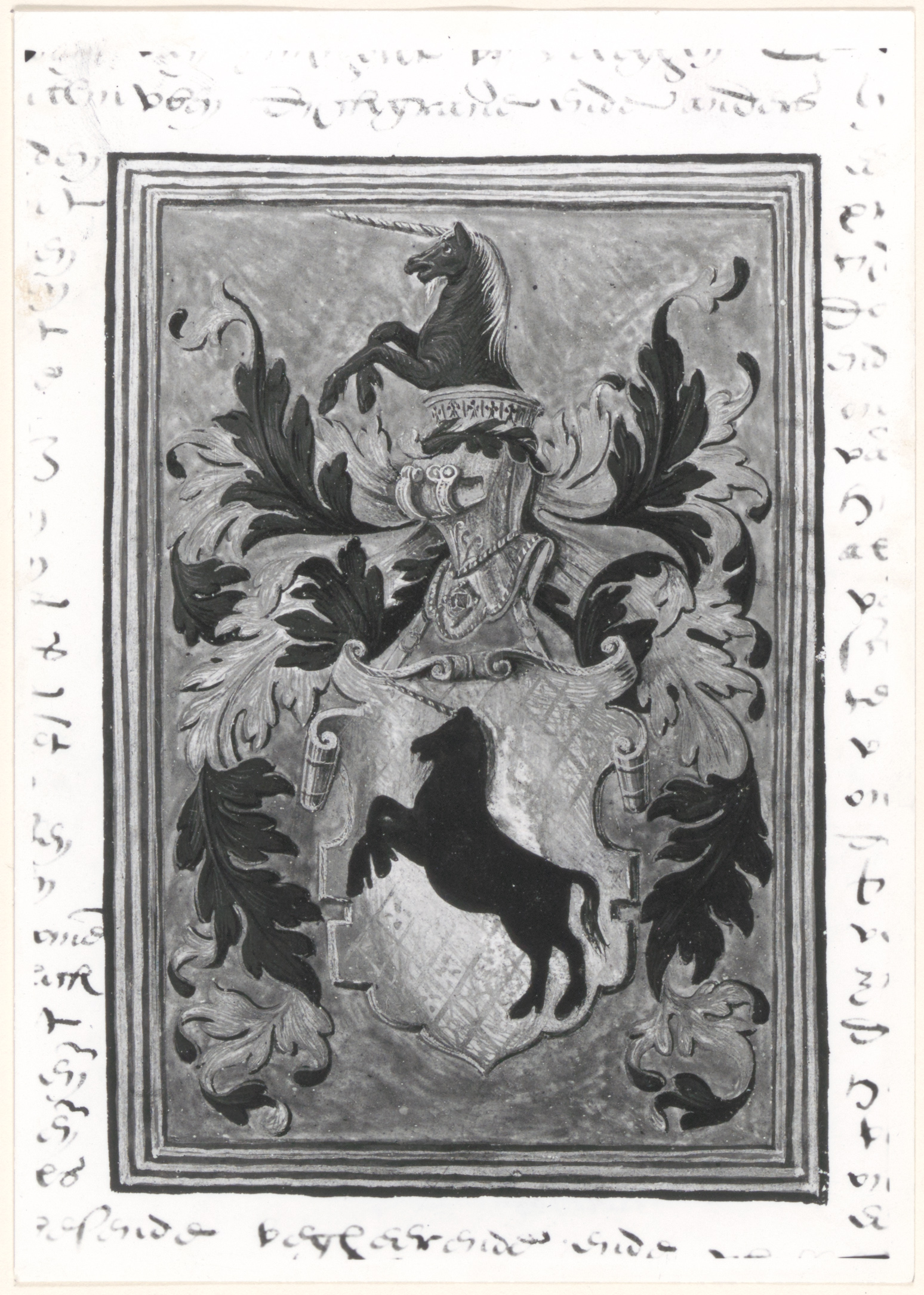 - Wapentekening van Arend Kornelisz. van der Mijle, 16de-eeuws burgemeester van Dordrecht, getekend in het adelsdiploma hem door Filips II in december 1570 verleend. Beschrijving schild: stijl hoog-renaissance, aan schildriem; wapen: zilver, een springende eenhoorn van sabel, gehoornd, gebaard en gemaand van goud; helm: driekwart gestelde traliehelm, 2 tralies zichtbaar; helmteken: uit een kuip van hermelijn(?) een uitkomende eenhoorn van het schild; helmkleden: sabel, gevoerd met zilver. Om de tekening is de tekst in handschrift van het diploma te zien.