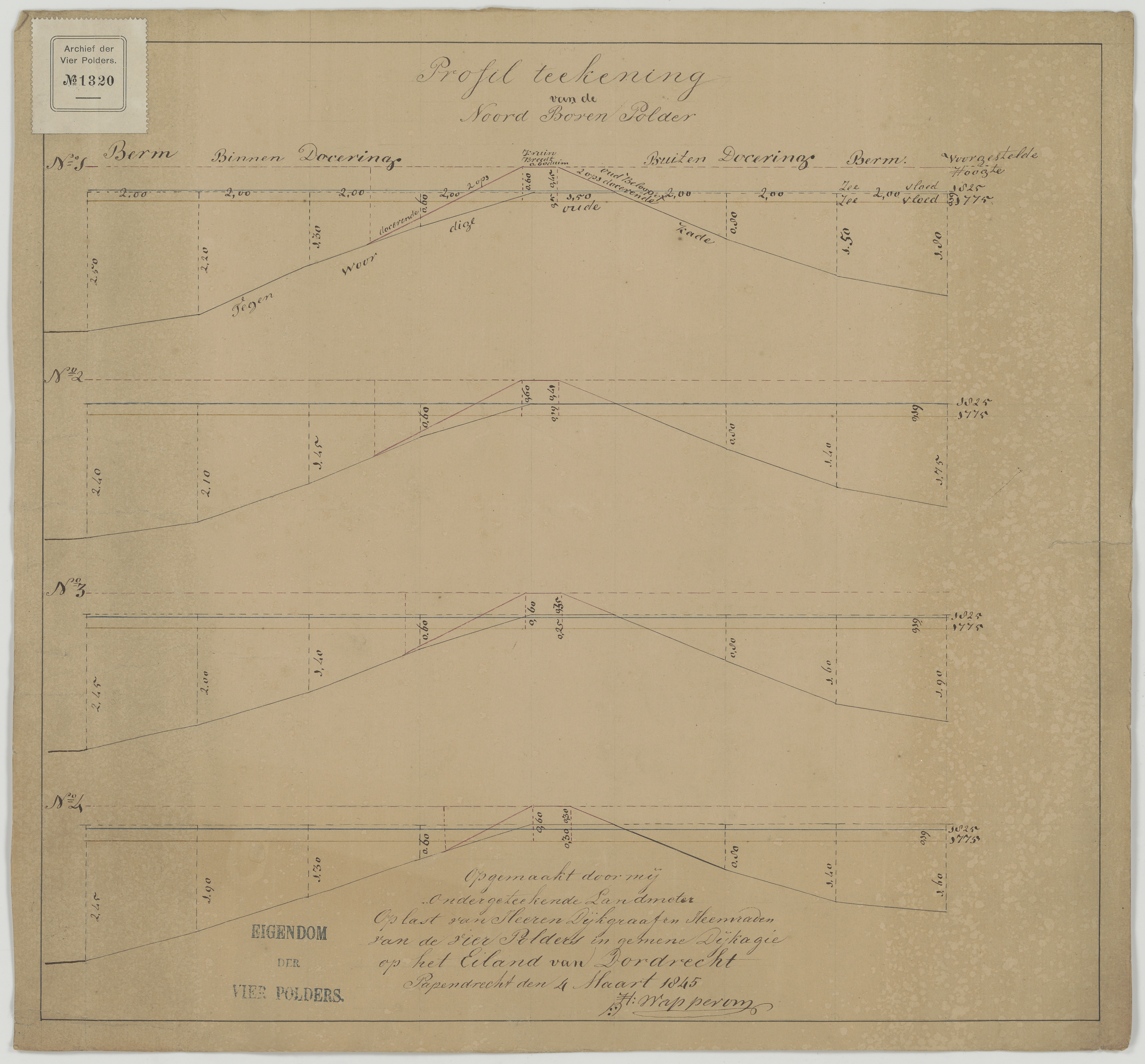 - Tekening van de profielen van de dijk en bermen van de Noord-Bovenpolder, opgemaakt door landmeter H. Wapperom, 1845