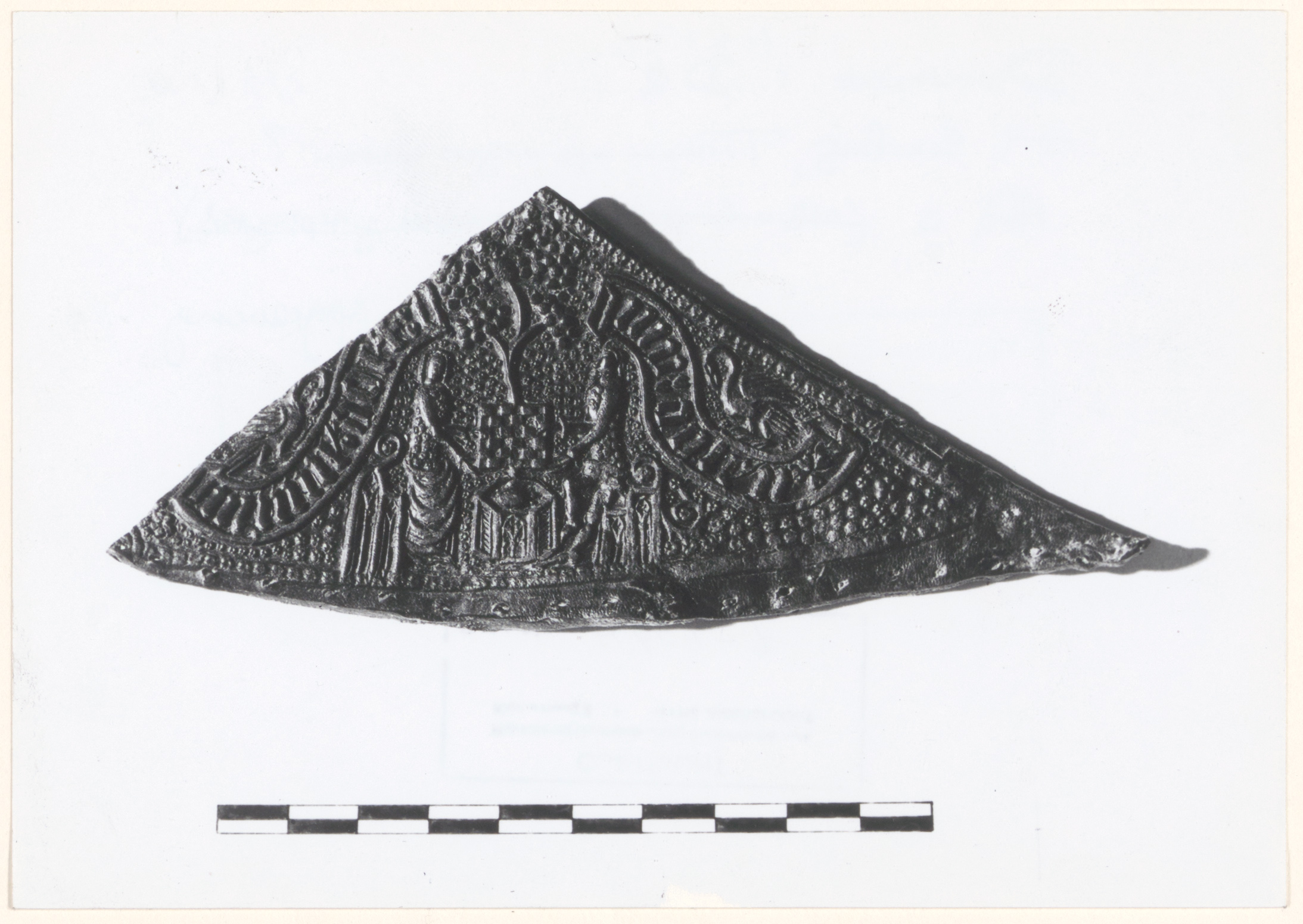 - Trip-blad (leren bovenblad van een slipper met houten zool) van een huwelijksschoen met voorstelling van pelikanen en guirlandes met het opschrift 'Minne Doet Mii Dolen' om een schaakspelend paar, gevonden bij opgravingen in de Dordtse binnenstad door het ROB o.l.v. H. Sarfatij.