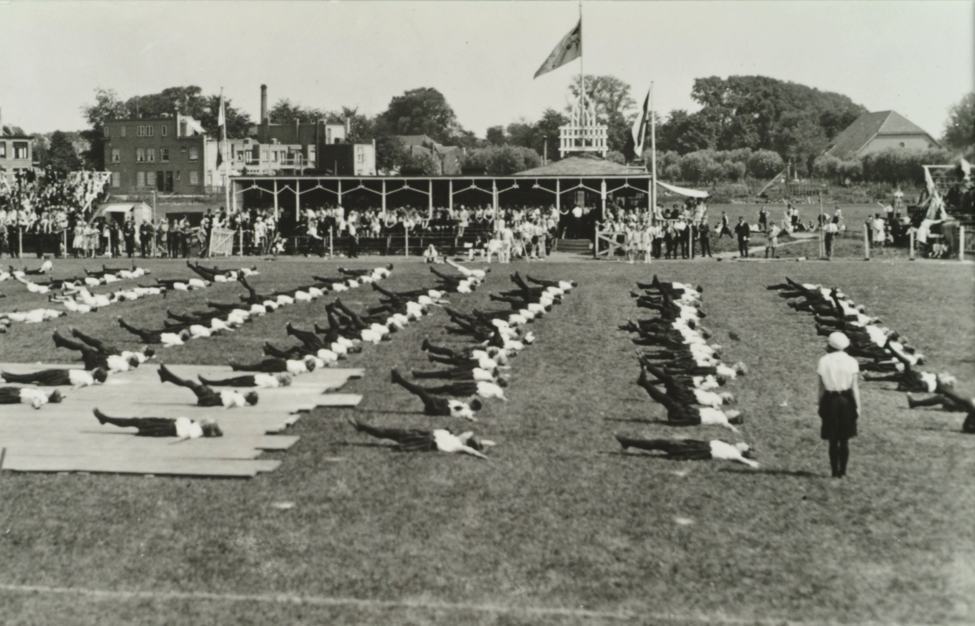 - Gymnastiekuitvoering op het DFC-terrein aan de Markettenweg, gezien richting Mariastraat.
