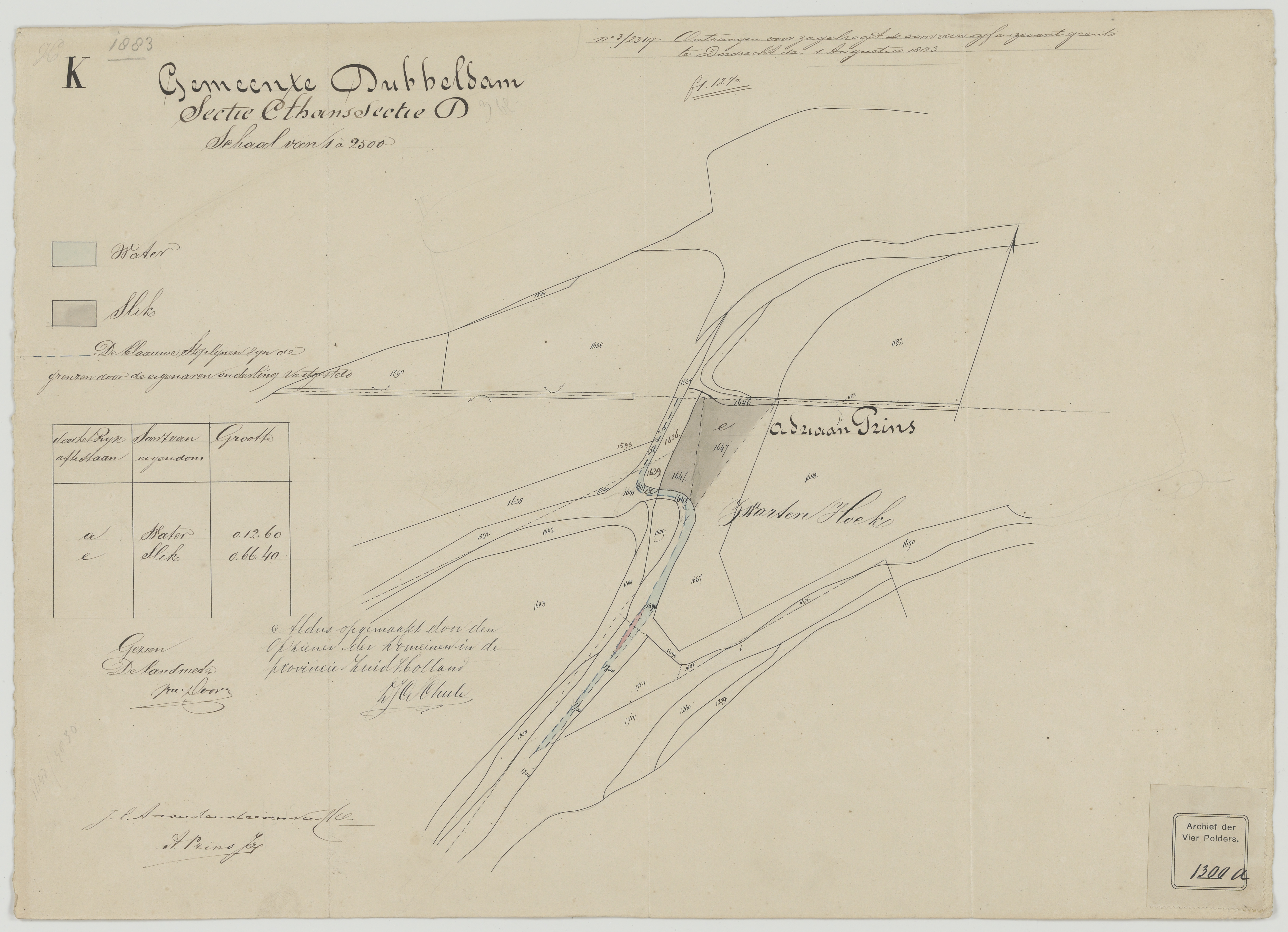 - Uittreksel van het kadastrale plan gemeente Dubbeldam, sectie D, betreffende de gronden van de polder gelegen in de Zwartenhoek, 1883