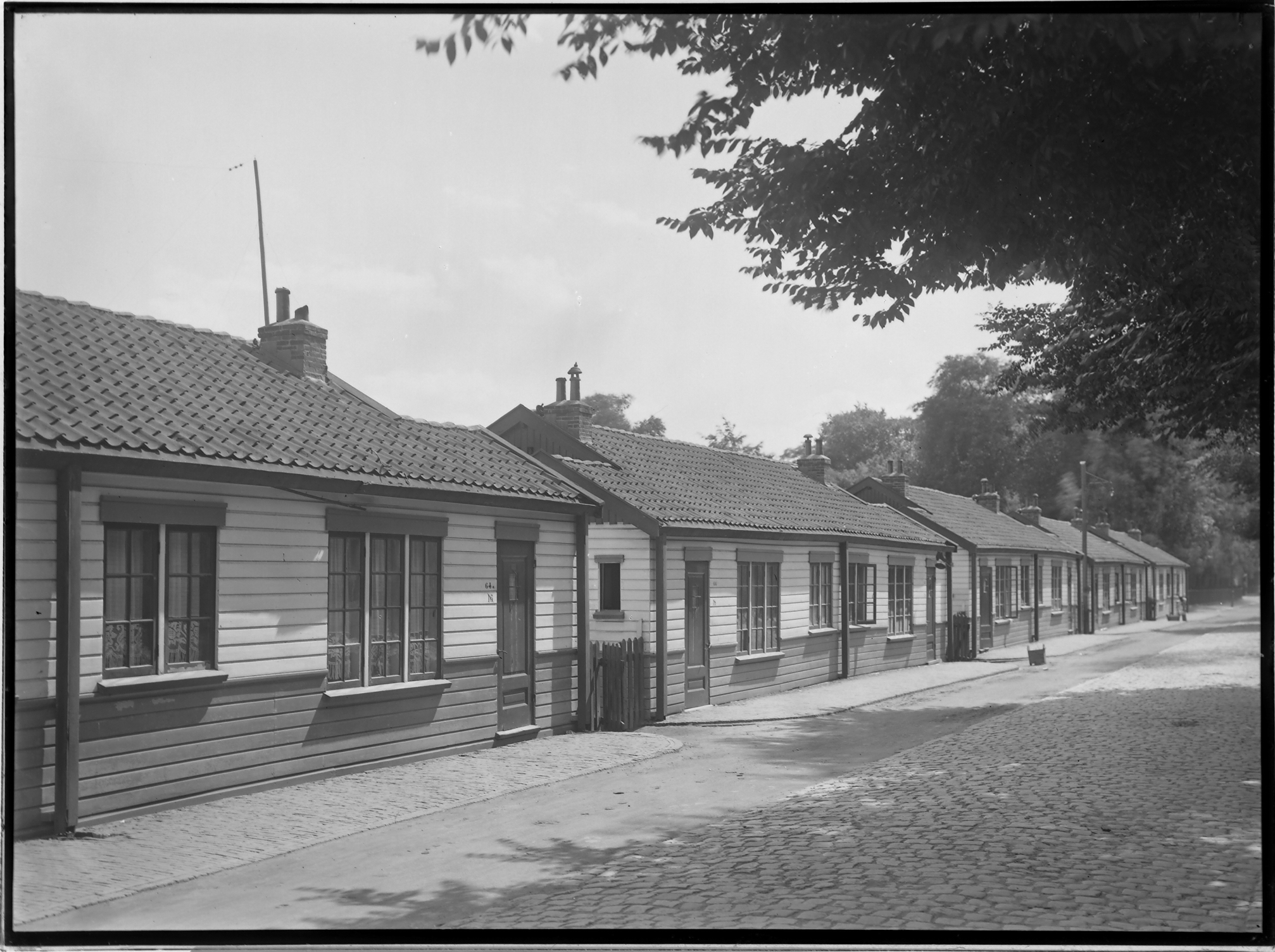 Dit is de Riouwstraat oostzijde. Van dit type noodwoning (2 onder 1 kap) zijn er 36 gebouwd aan de Bankastraat (in rijtjes van 4, 6 en 8) en 16 aan de Riouwstraat in één rij.