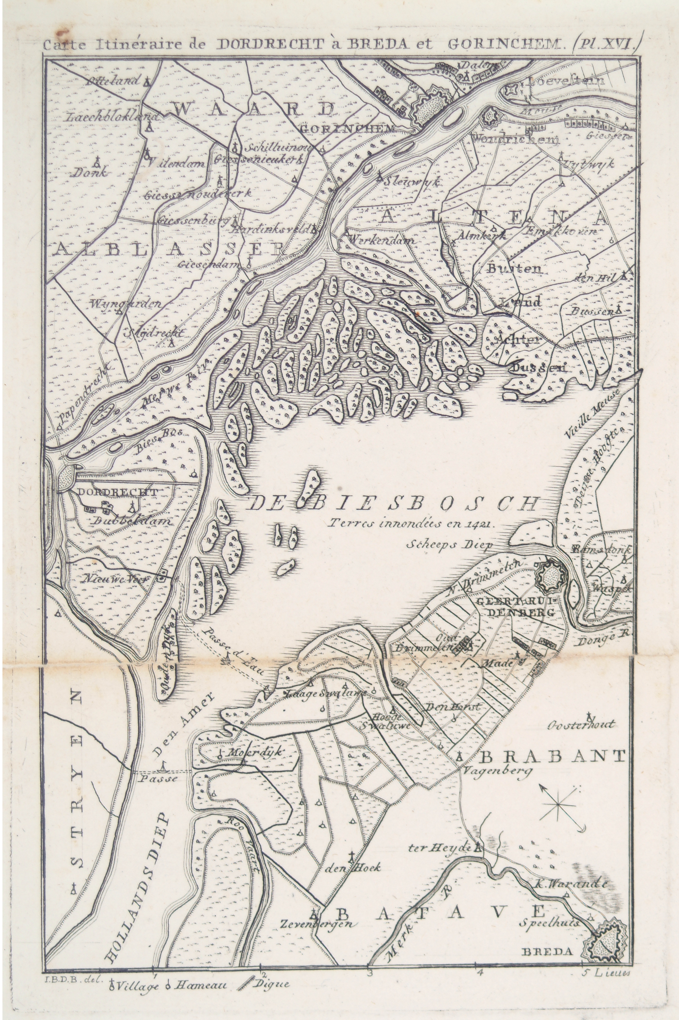- Uit: Atlas faisant partie du Voyageur en Hollande. Titel en datering van de atlas (oorspronkelijk zonder titel) waar dit kaartje uit afkomstig is, zijn ontleend aan de beschrijving in de catalogus van de U.B. Leiden, signatuur 1159 G 19. - J.B. de Bouge was chef van de afdeling van het 'Depot de la Guerre' te Amsterdam, waar de koperplaten gegraveerd werden.