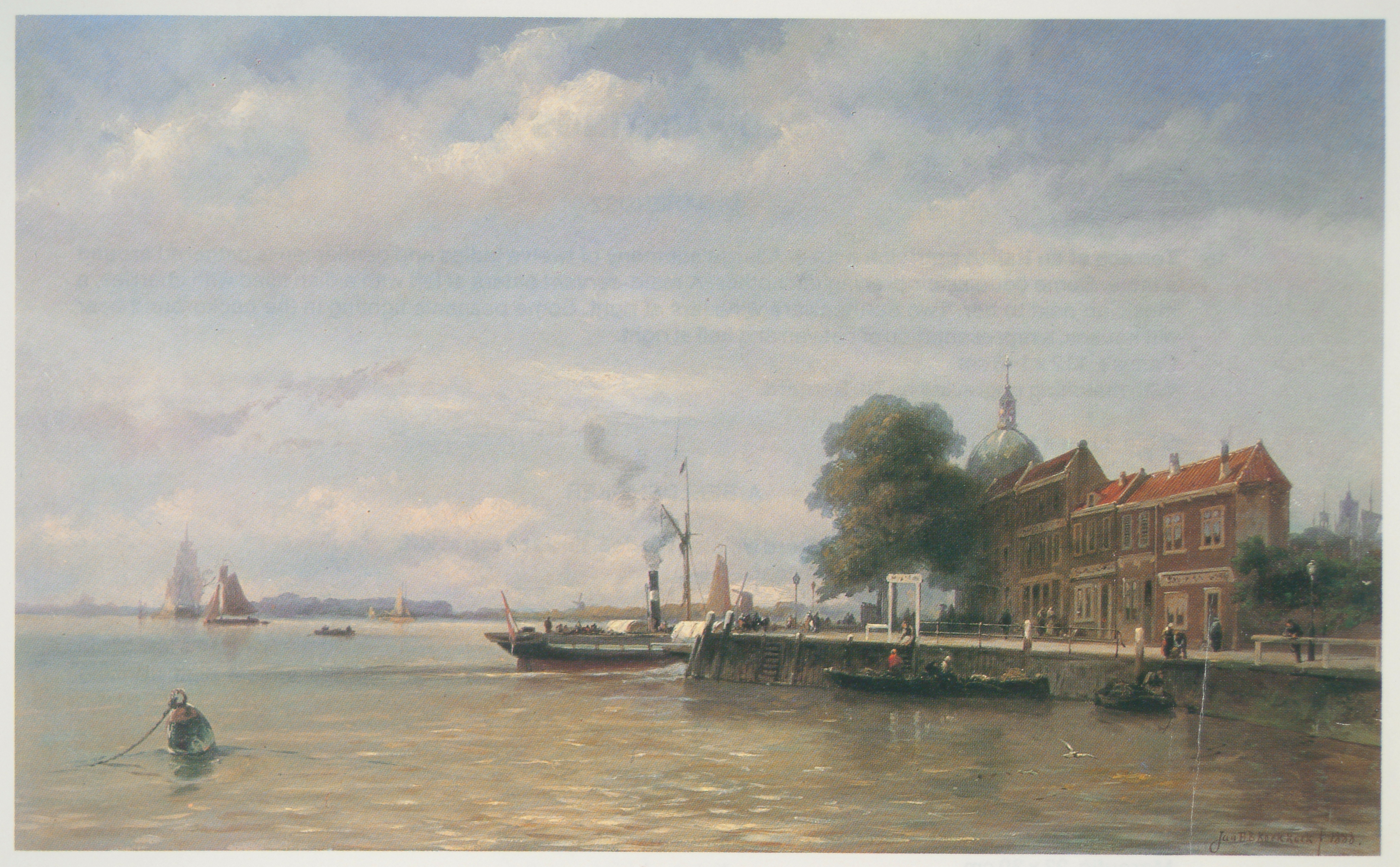 J.H.B. Koekkoek maakte verschillende varianten van dit gezicht op het Groothoofd. Een uitgebreide versie is bij Daatselaar Fine Art & Antiques: https://www.daatselaar.com/Fine-Art/Paintings/A-V.O.C.-merchant-ship-in-the-roads-of-Dordrecht als: A V.O.C. merchant ship in the roads of Dordrecht with numerous figures on a quay Oil on canvas | 88 x 125 cm | Signed: Jan H.B. Koekkoek met een waarschijnlijk fictieve (17de-eeuwse?)historische scene met (koopvaardij)schepen voor het Groothoofd. Een kleinere versie met alleen het Groothoofd en de stoomboot was bij Kunstgalerij Albricht B.V. (in 2012 en jaren daarvoor) als: J.H.B. (JAN) KOEKKOEK (1840 Amsterdam - 1912 Hilversum) “Aan de kade met zicht op de "Groote Hoofdpoort" te Dordrecht” Olieverf/paneel: 23,5 x 39,5 cm