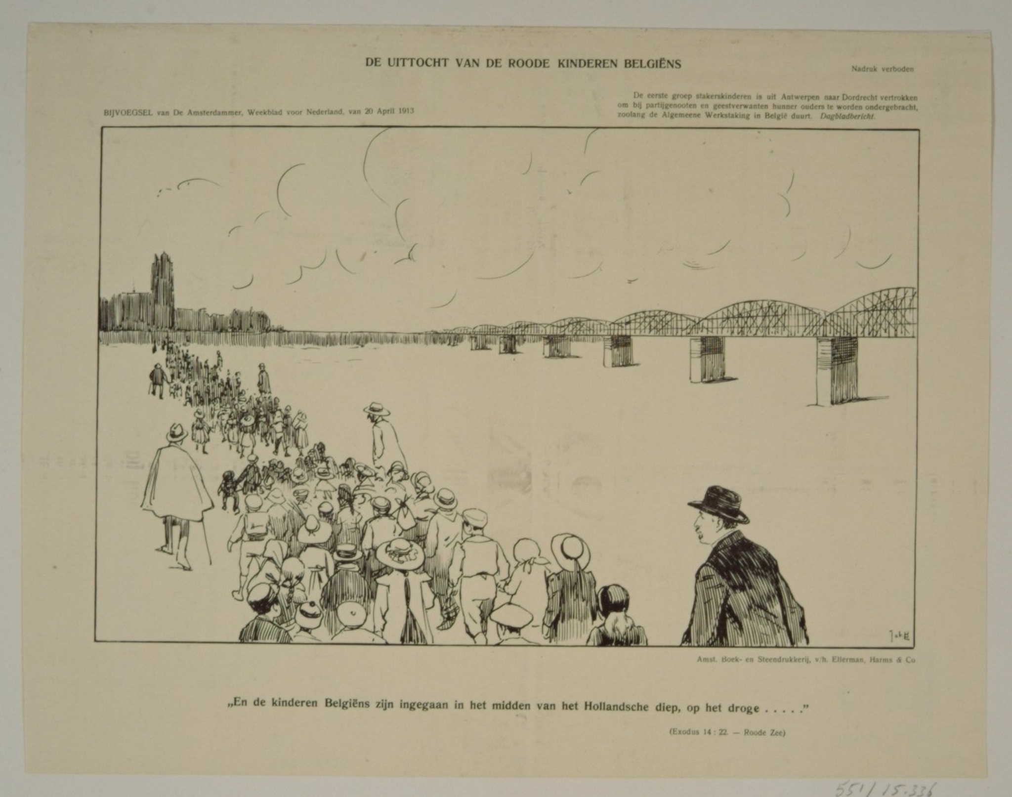 - Tekening van de intocht te Dordrecht van Belgische kinderen, die hier tijdens de werkstaking van 1913 onderdak vinden; met opschrift De uittocht van de roode kinderen Belgiëns en onderschrift En de kinderen Belgiëns zijn ingegaan in het midden van het Hollandsche Diep op het droge ... (Exodus 14:22 Roode Zee).