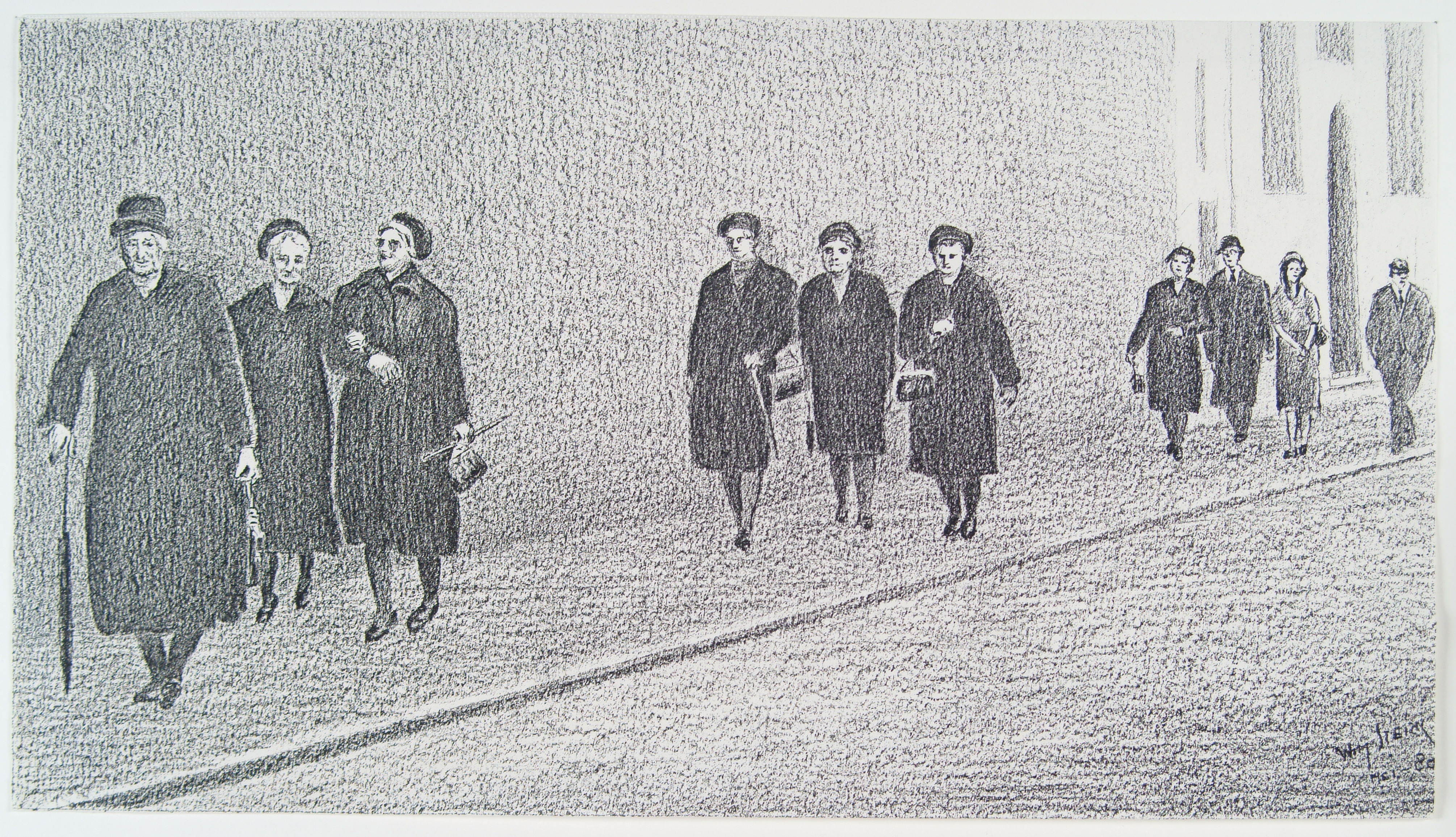 Kerkgangers bij gebouw Calvijn aan het Kromhout.