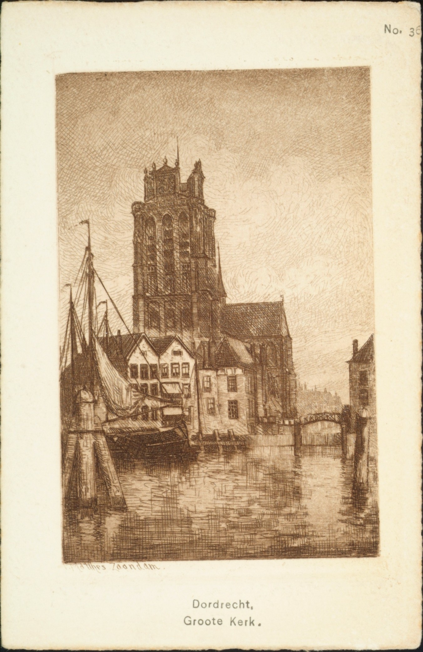 Tekening van de Grote Kerk en de achterkant van huizen aan de Korte Geldersekade, gezien over de Bomhaven. Rechts de Leuvebrug.
