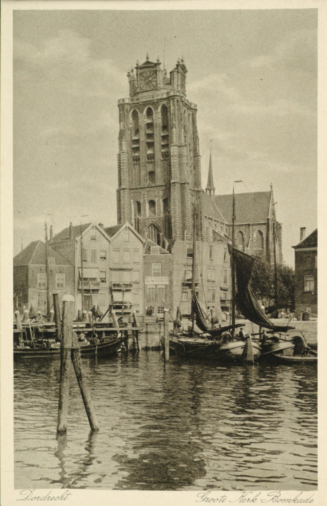 - De Grote Kerk en de achterkant van huizen aan de Korte Geldersekade, gezien over de Bomhaven.