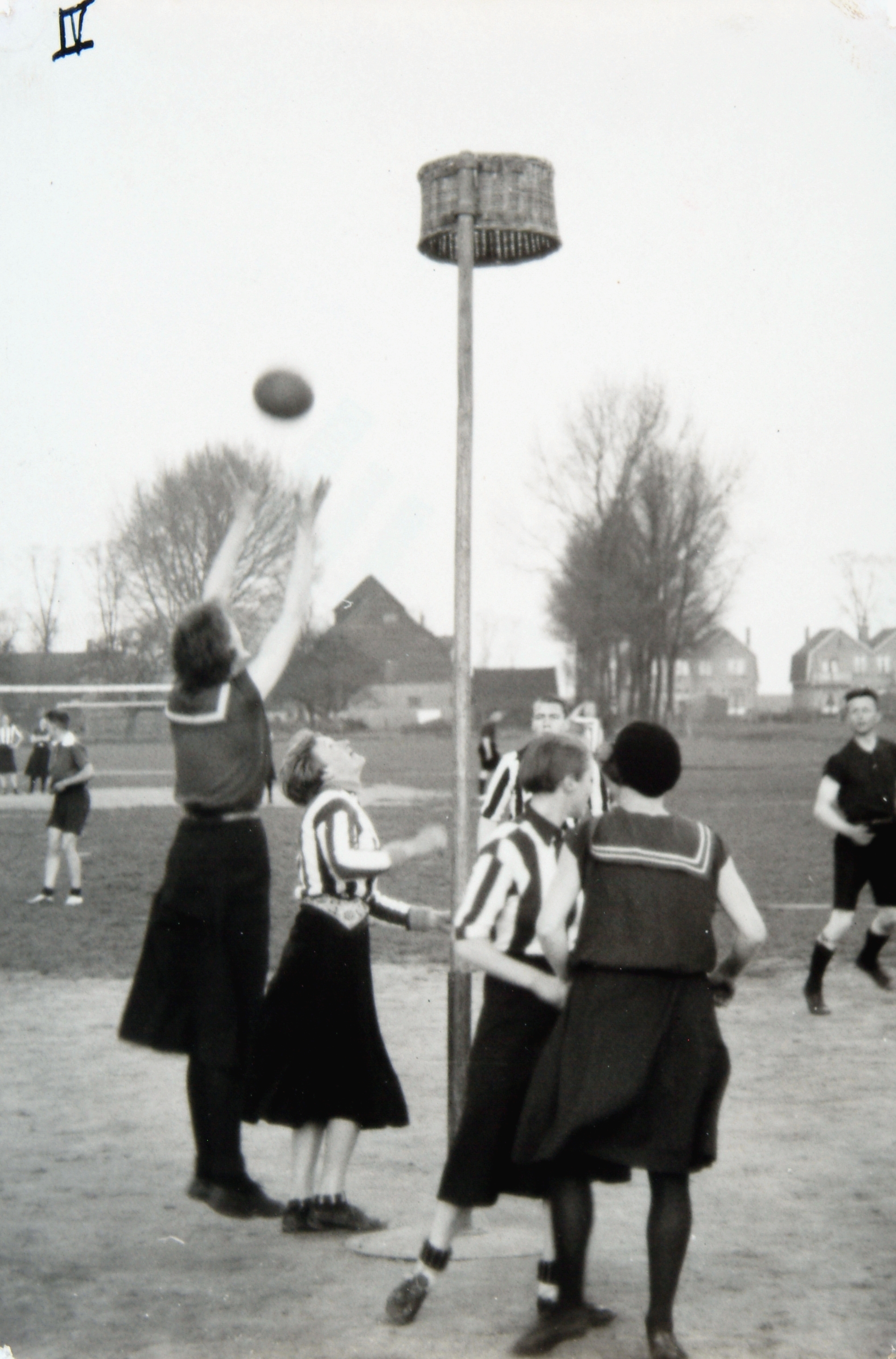 - Spelmoment uit de korfbalwedstrijd Deetos-Westerkwartier op het terrein achter boerderij Noordhoeve gelegen aan de toenmalige Reeweg Oost, later Haaswijkweg West, waarlangs de huizen op de achtergrond staan. Deetos won met 8-3.