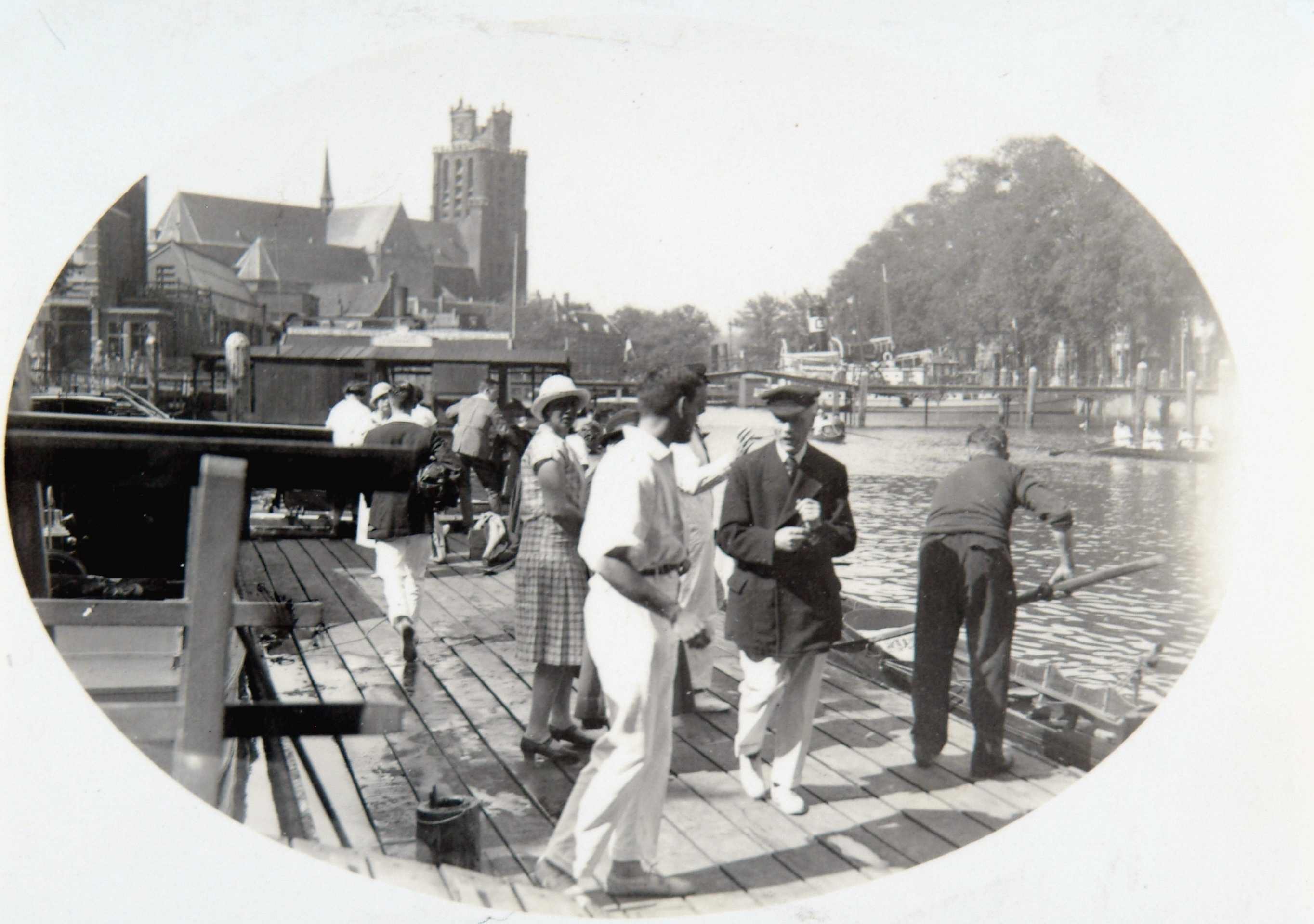 - Gezicht op de Nieuwe Haven (rechts) vanaf het botenhuis van de Koninklijke Dordtsche Roei- en Zeilvereeniging. Met pet is de heer Mr. Van Drooge. Op de achtergrond de Lange IJzerenbrug en de Grote Kerk.