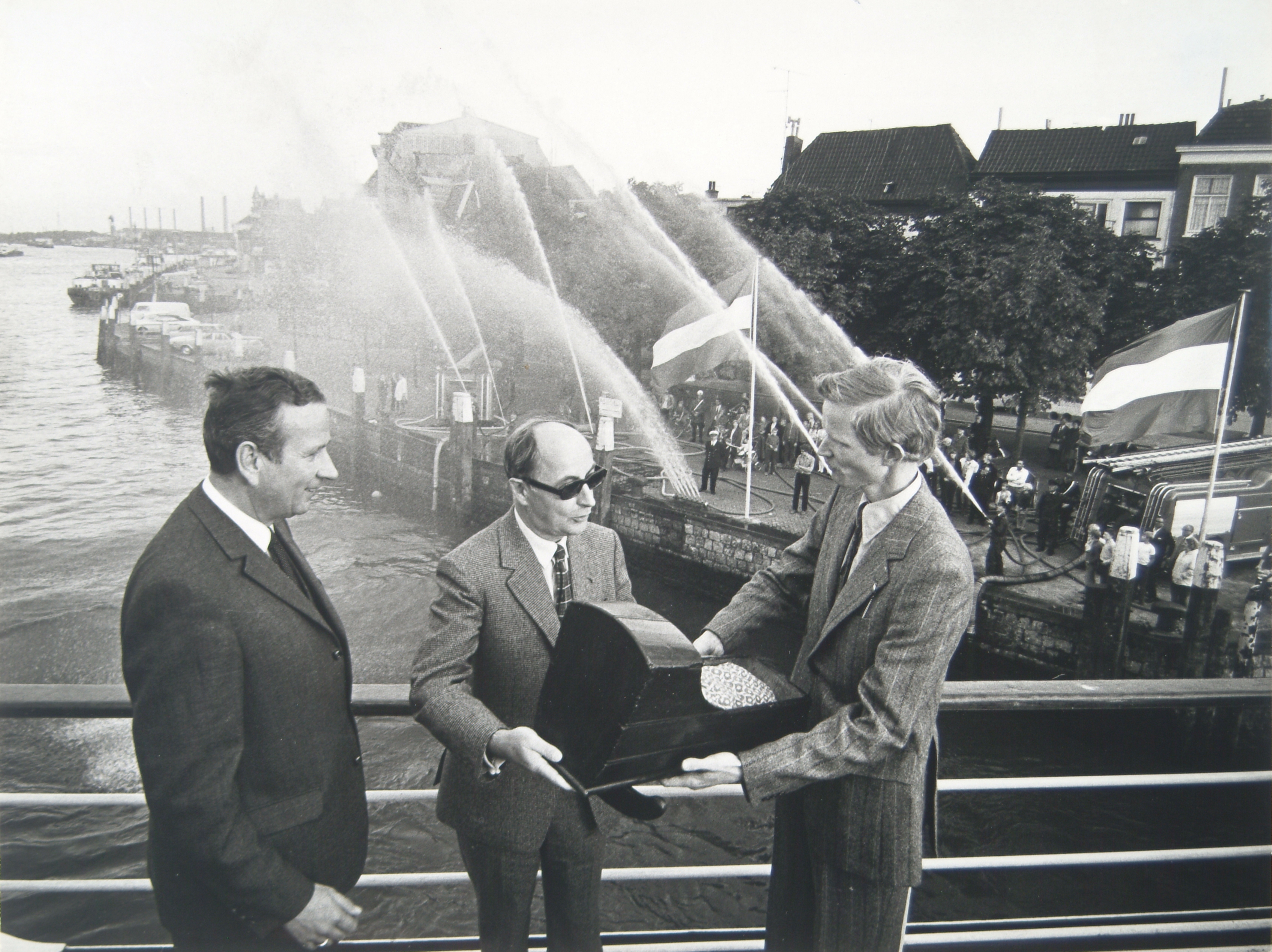 Directeur J. de Groot, directeur Dordrechts Museum, biedt burgemeester J.J. van der Lee een wiegje aan terwijl op de achtergrond de brandweer water in de lucht spuit
