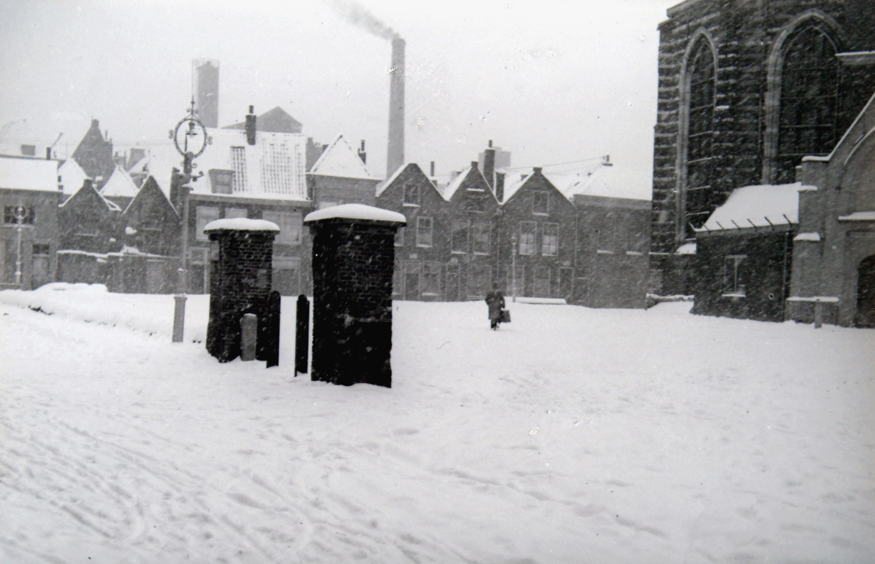 Gezicht op de noordzijde van het Nieuwkerksplein. Op de achtergrond de schoorsteen en enkele gebouwen van de gasfabriek.