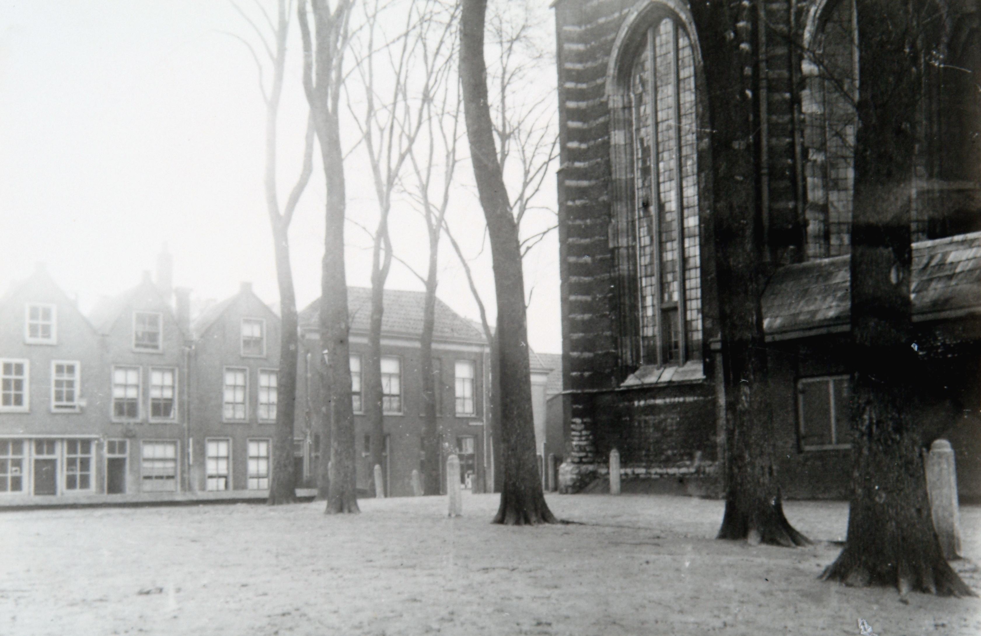 De westzijde van het Nieuwkerksplein. De kerk en het plein liggen hoger dan de straten en huizen er omheen. Gedeeltelijk rondom het plein is een stenen beer gebouwd (links).