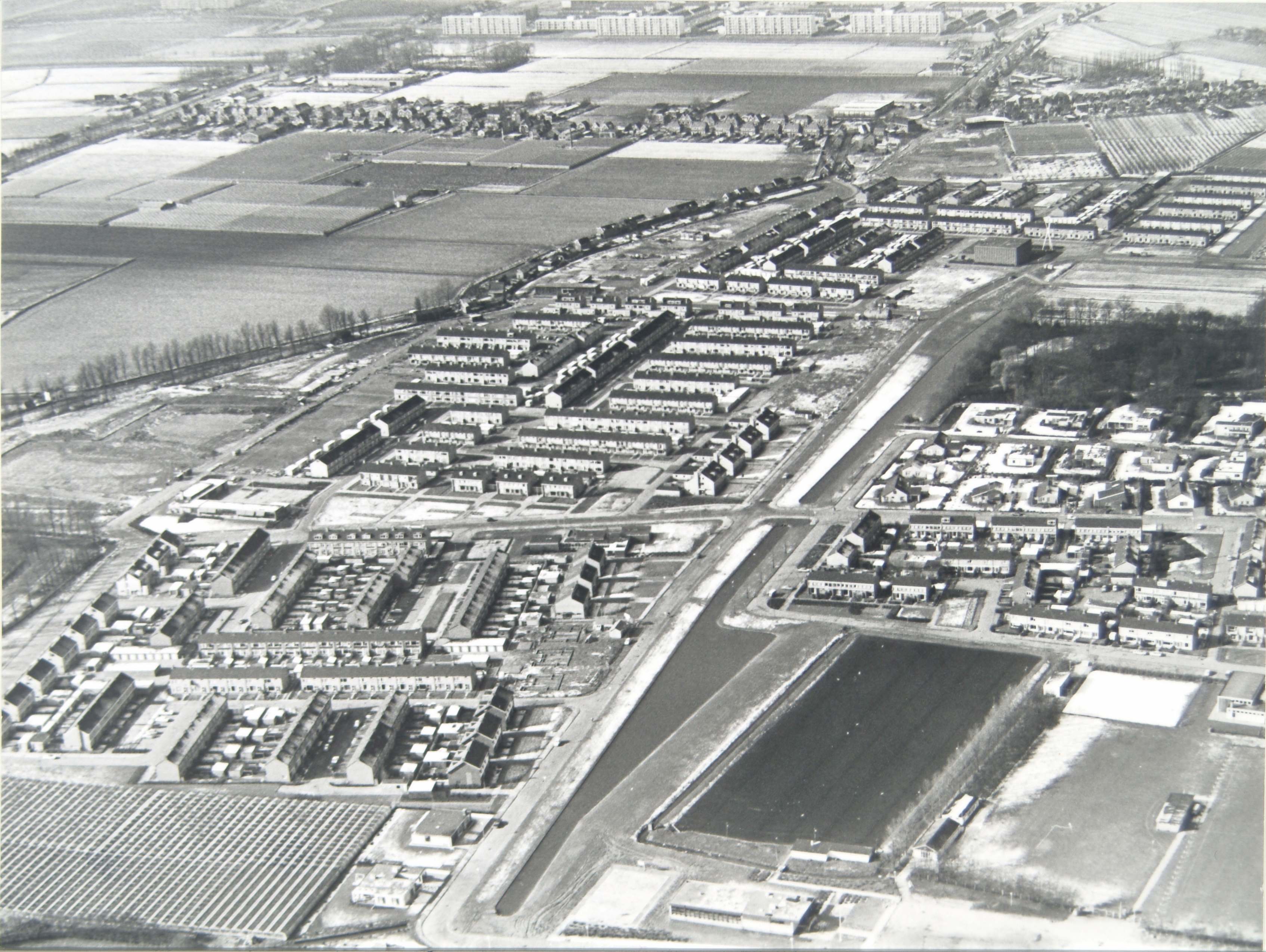 - Luchtfoto van Dubbeldam uit het oosten tussen Oudendijk en Gravensingel. Linksonder Middenhoeve