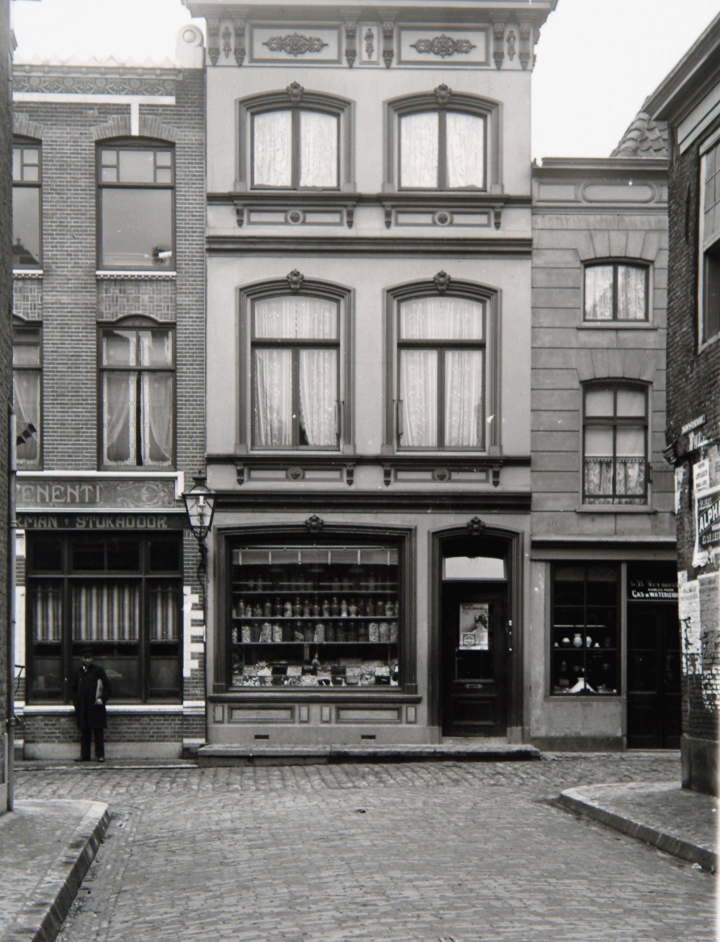- Komend uit de Hofstraat, zicht op de winkel met suikerwerken van grossierderij Van de Weg in de Nieuwstraat. Links architect/stukadoor Tenenti, rechts gas- en waterfittingsbedrijf Vermeulen.