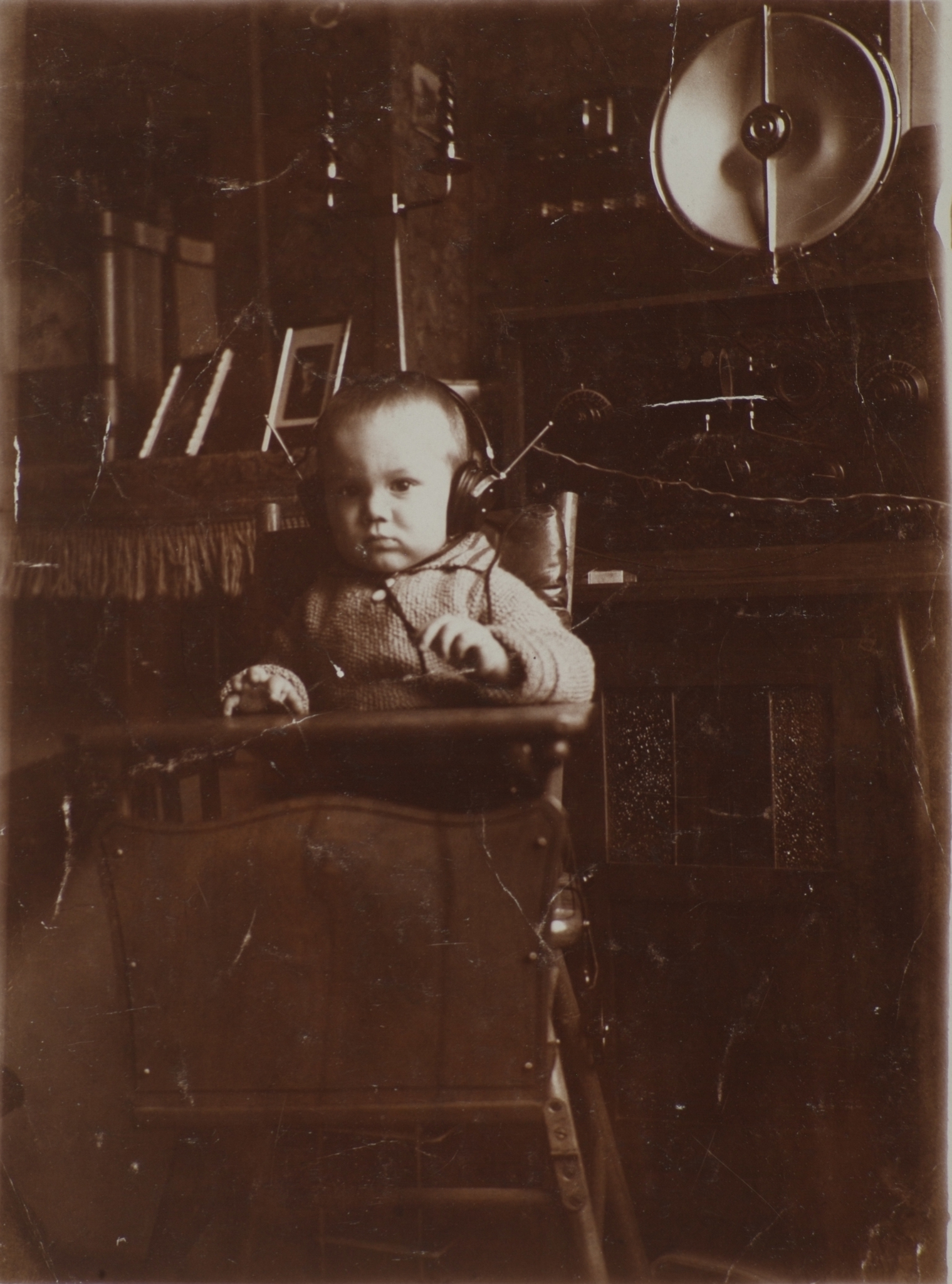 - Jan Meijer zoon van Jennie van Rijswijk en Bertus Meijer in het huis aan de Rechte zandweg 41 met koptelefoon met antenne
