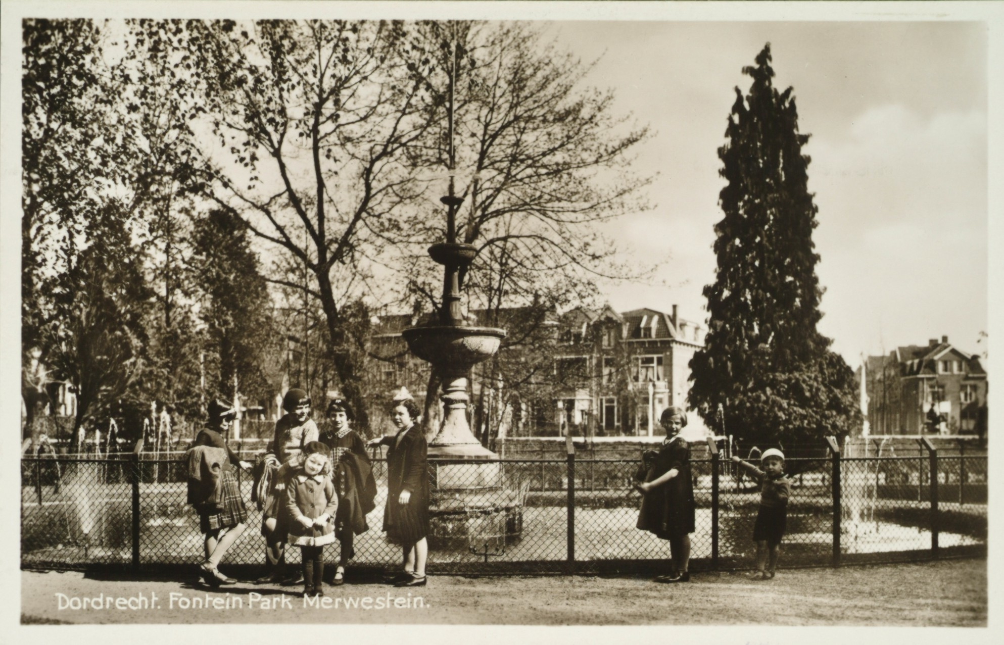 - Vijver met fontein in Park Merwestein. Op de achtergrond links de Oranjelaan en rechts het Sumatraplein.