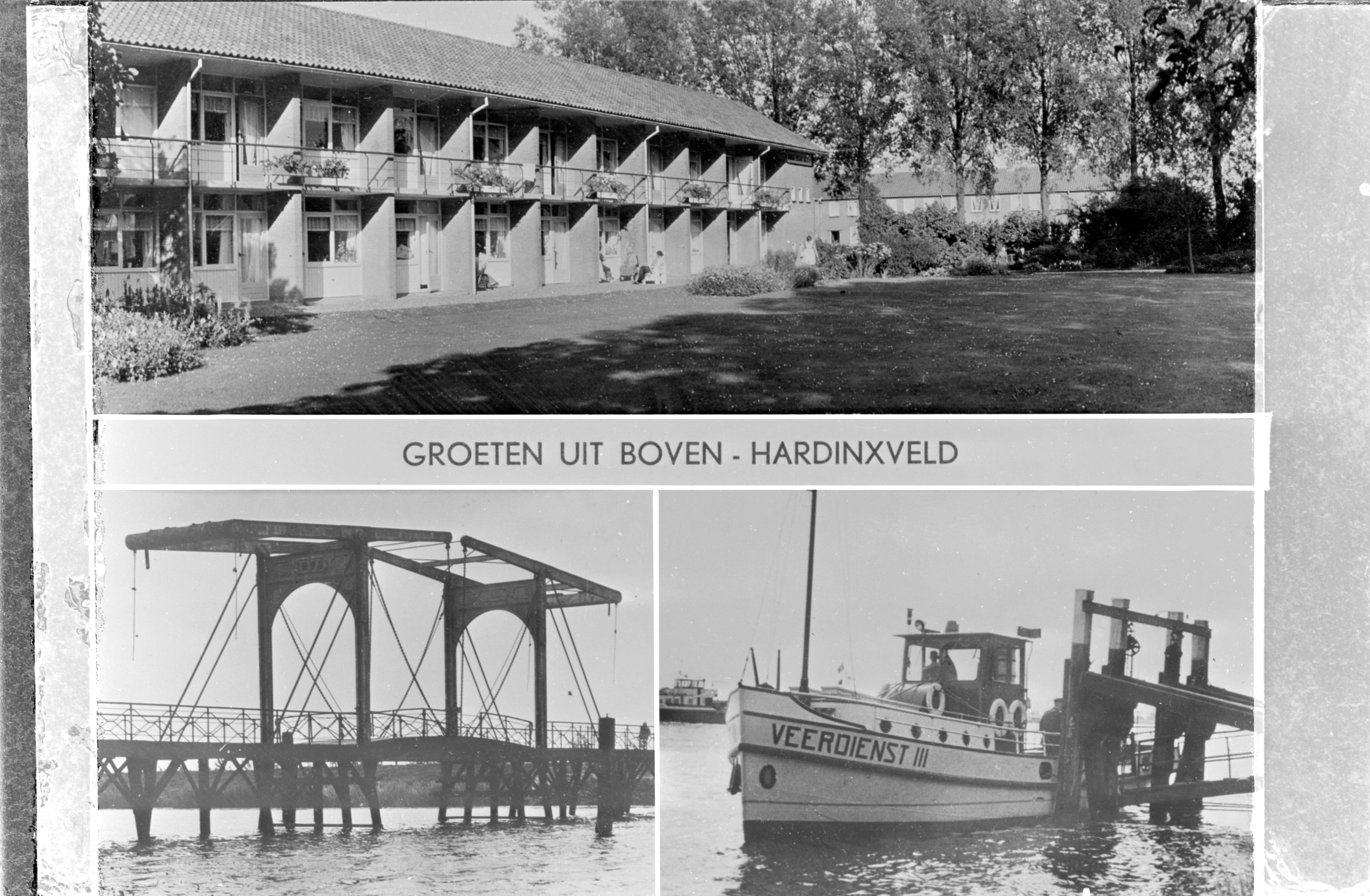 Boven: Woningen van de Burgemeester de Boerstichting aan de Koningin Wilhelminalaan in Boven-Hardinxveld. Linksonder: De Huibjesbrug over het Kanaal van Steenenhoek. Rechtsonder: Veerdienst III bij de aanlegsteiger aan de Rivierdijk.