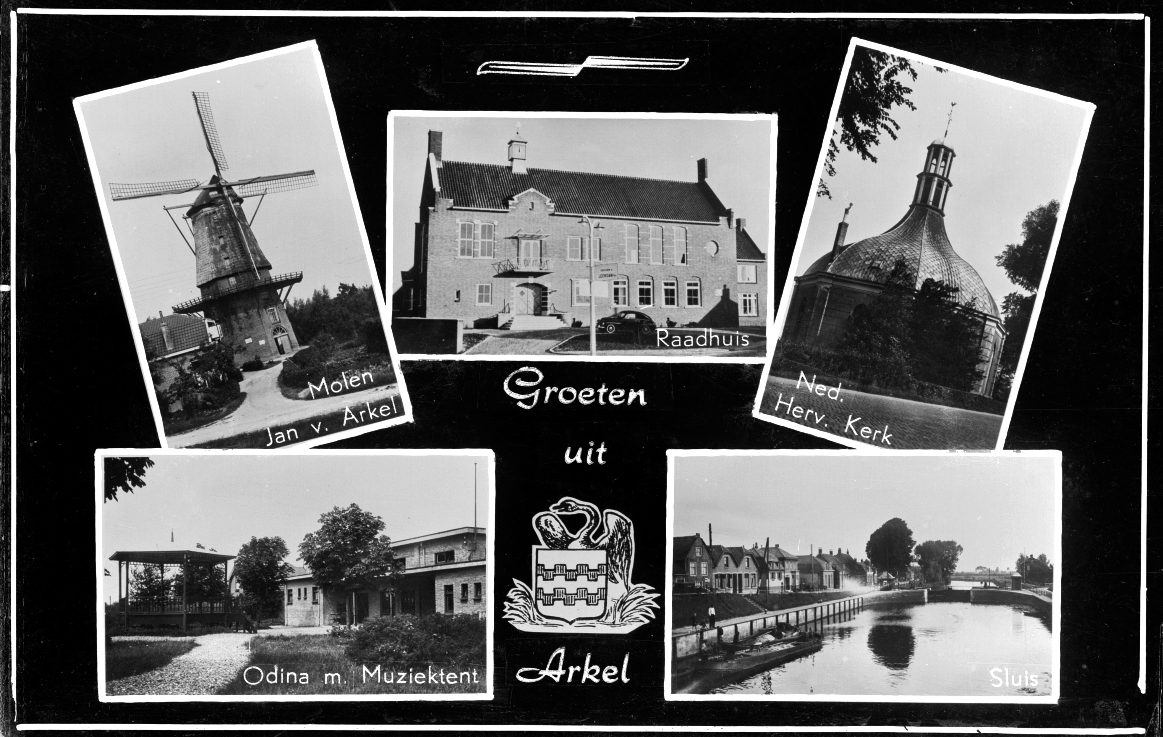 Arkel, 'groeten uit...' prentkaart. Afbeelding van molen 'Jan van Arkel', Odina Muziektent, Raadhuis, Nederlandse Hervormde Kerk, sluis.