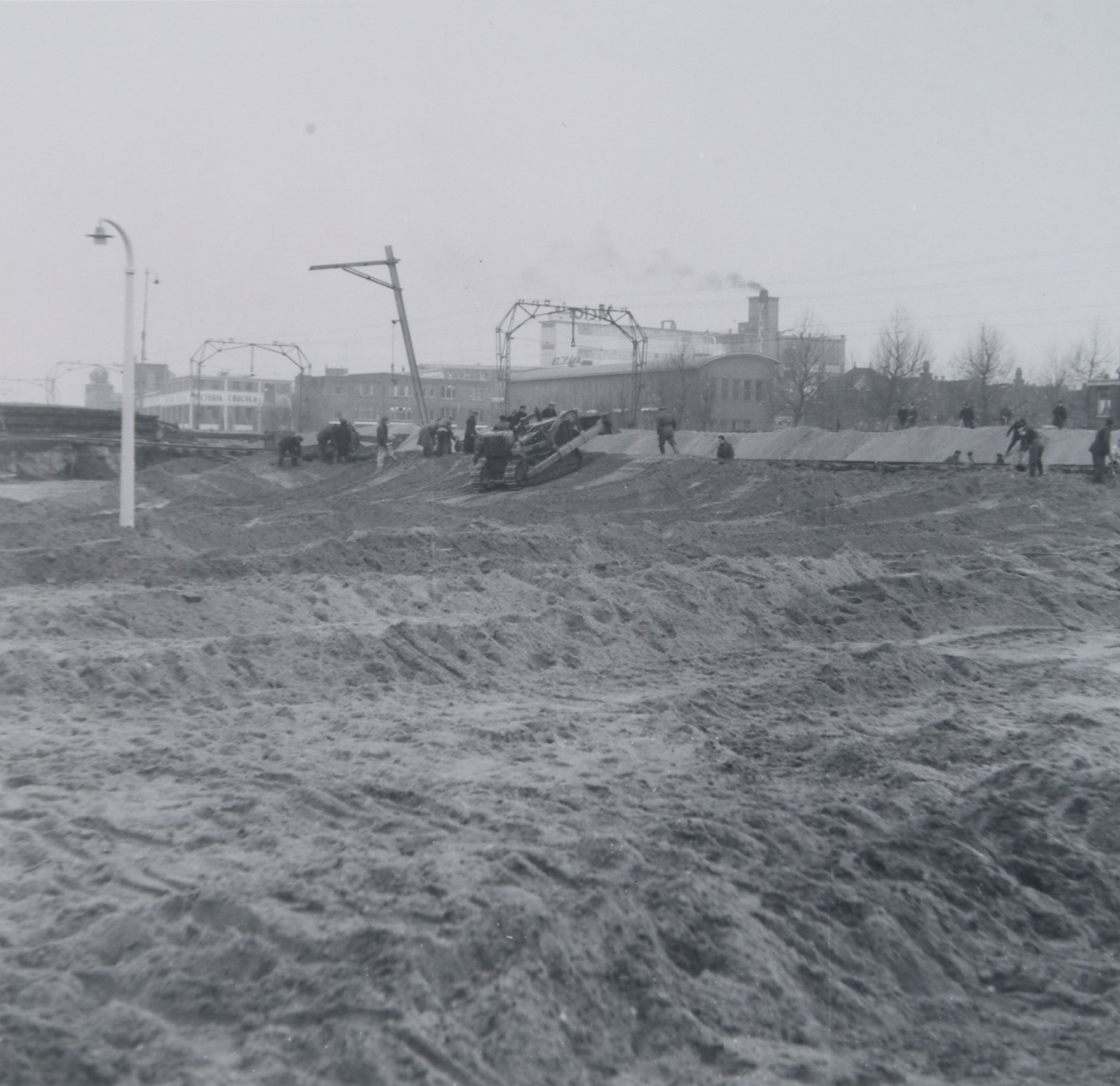 - Vlietweg met zand afkomstig van het spoorwegemplacement ten gevolge van de watersnoodramp februari 1953. Met op de achtergrond de Victoria