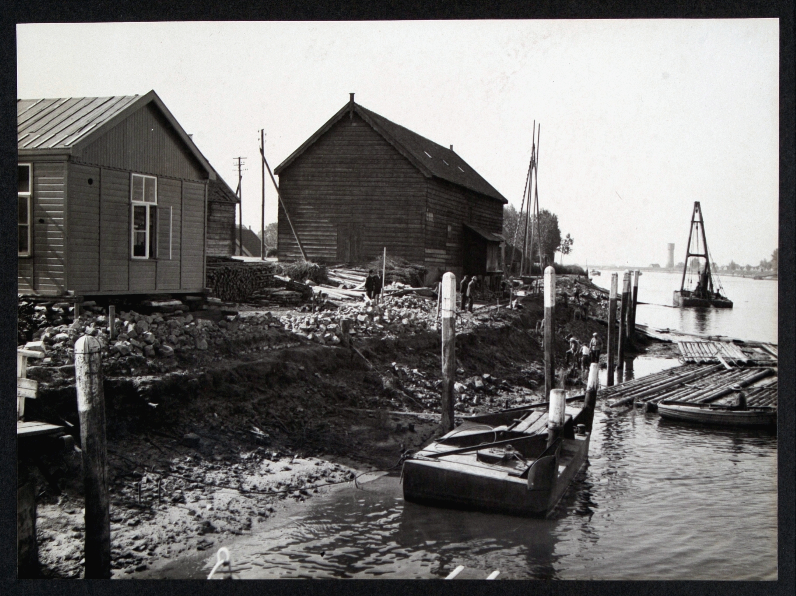 Grondwerken bij het 's-Gravendeelse veer aan de Wieldrechtse Zeedijk met op de …