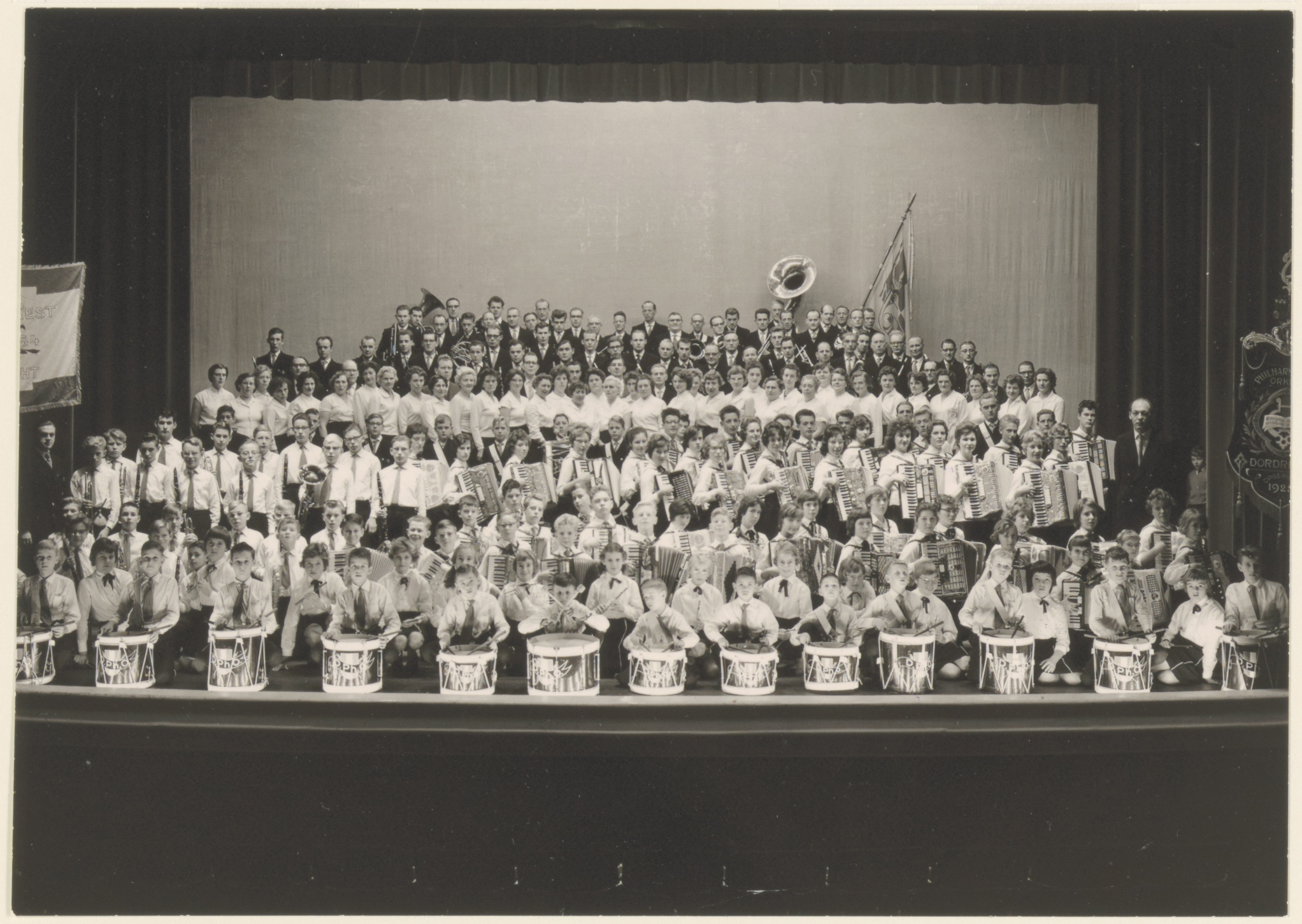 - Groepsportret van het Dordrechts Philharmonisch Orkest op het toneel van Kunstmin. Rechts staande in zwarte jas, Johan Zilverschoon.