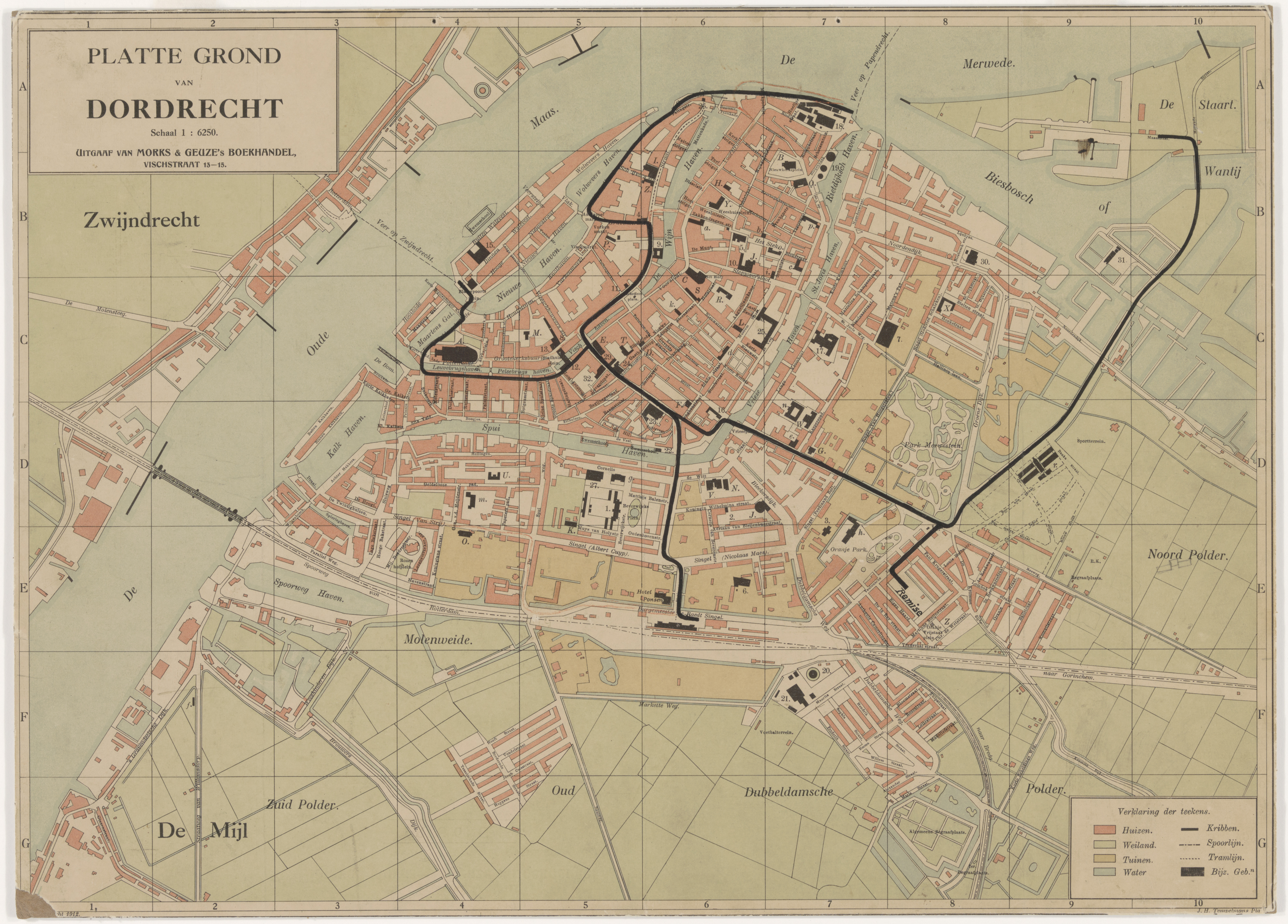 - Plattegrond van Dordrecht met markering van bijzondere gebouwen. De route van de paardentram (stippellijn) liep vanaf het station tot aan het Groothoofd. De zwarte lijn geeft de route van het plan voor een elektrische tramlijn aan. Het station wordt verbonden met de pontveren naar Zwijndrecht en Papendrecht en een eindhalte in de Maasstraat. Het begin- en eindpunt is gesitueerd op een terrein aan de Toulonselaan, de huidige Cronjéstraat.