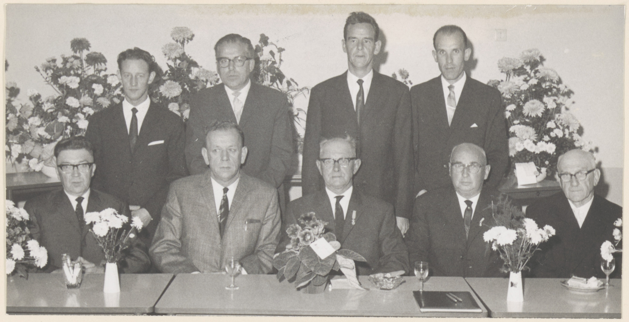 - Het bestuur van woningbouwvereniging Algemeen Belang te Hendrik-Ido-Ambacht tijdens een receptie naar aanleiding van het 50-jarig jubileum in De Schoof in oktober 1965.