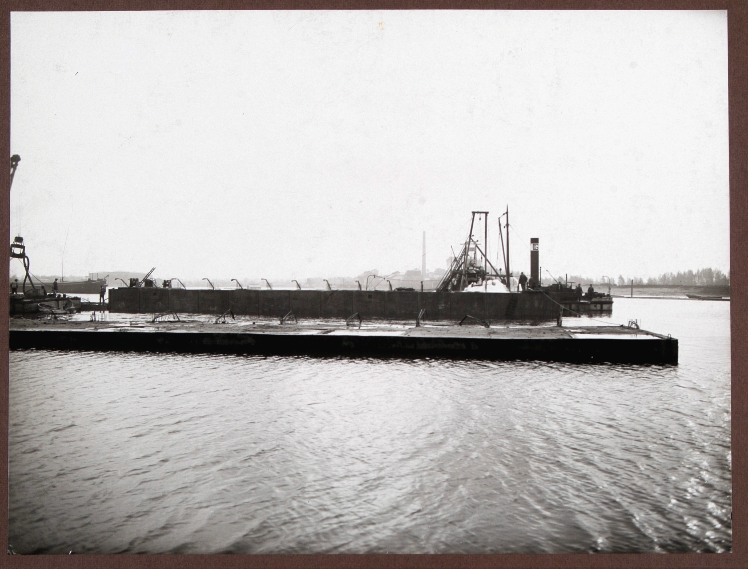 - Volspuiten van caissonsfries tijdens de aanleg van de Wilhelminahaven op de achtergrond een stoombaggerschip