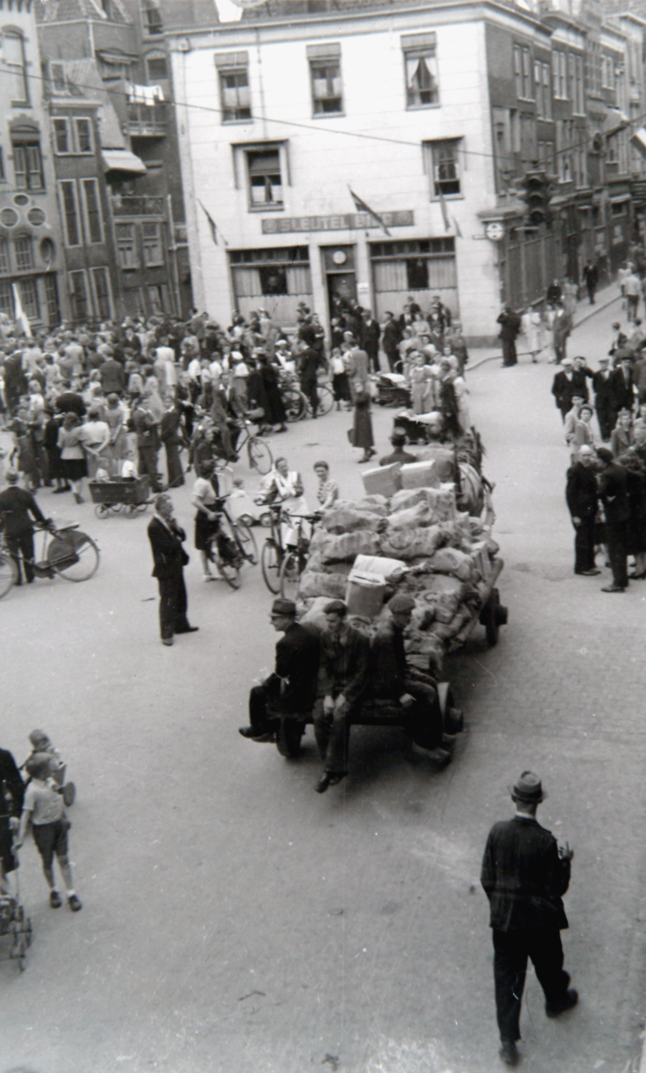 - Een sleperswagen rijdt vlak na de bevrijding op het kruispunt Visbrug/Visstraat/Voorstraat in de richting van het Scheffersplein. Op de wagen rijden mannen mee om de voedselpakketten te bewaken. Die pakketten waren gedropt uit Engelse vliegtuigen in de Hoeksewaard net voordat W.O. II was afgelopen. Jute zakken zaten vol met eerst behoeftig voedsel, zelfs sigaretten, en blikken met kaakjes.