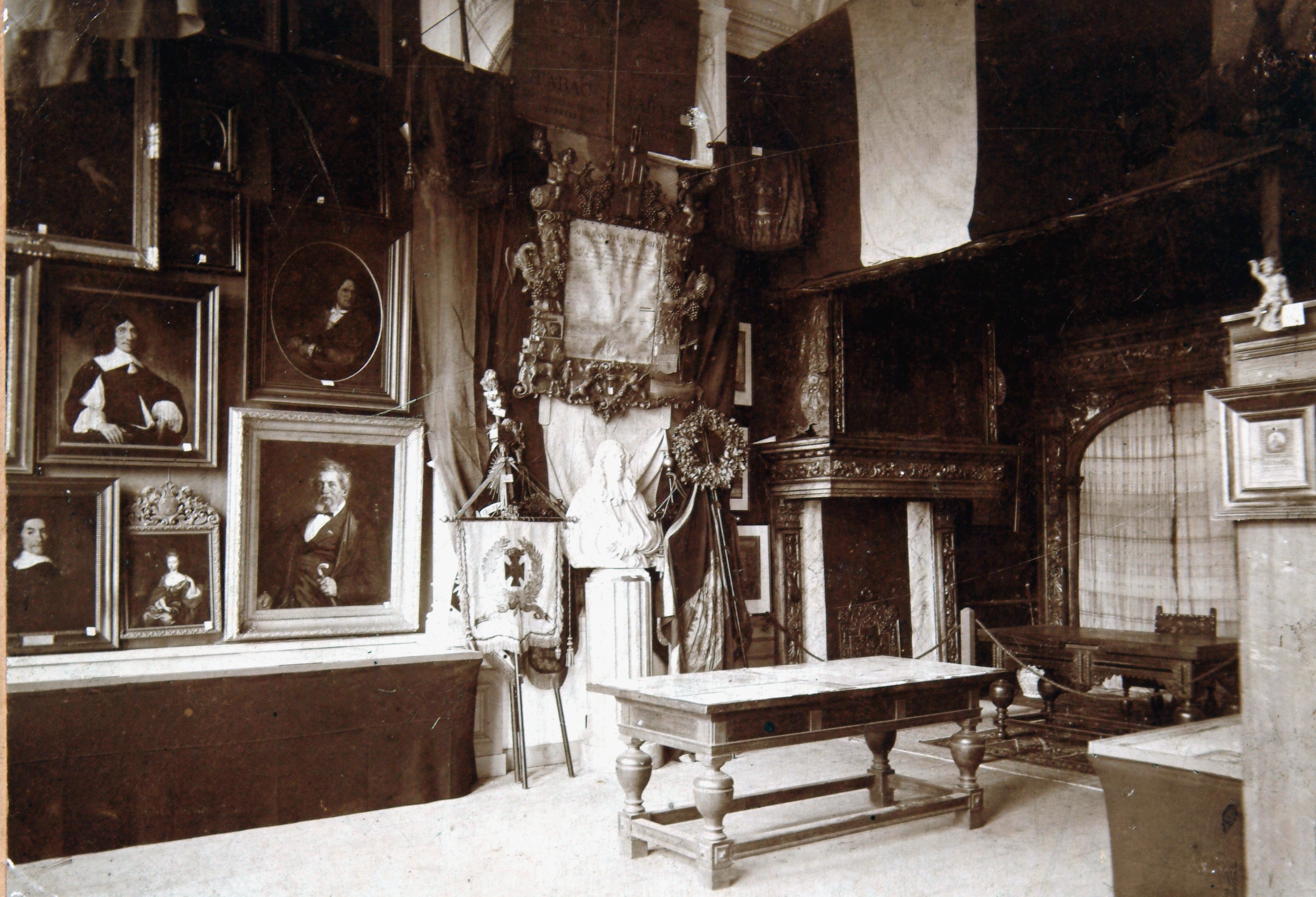 Er hangen schilderijen die zich in het Dordrechts Museum bevinden zoals Nicolaes Maes, Portret van Jacob de Witt (linksonder), het portret van Mr. Pieter Blussé van Oud Alblas door Jozef Israëls met daarboven het ovale portret van de beeldhouwer Hendrik Noteman door Arent de Gelder (niet in de originele lijst), rechts daarvan de Wijnkopersgildelijst (kuipersgilde) en daaronder de marmeren buste van Johan de Witt door Quellinus en rechts daarvan de goudleerkamer uit de Rozijnkorf (Hidde Nijland). Opvallend is ook het kleine portret van Arendina Cuyp door Constantijn Netscher (tweede van links onderaan).